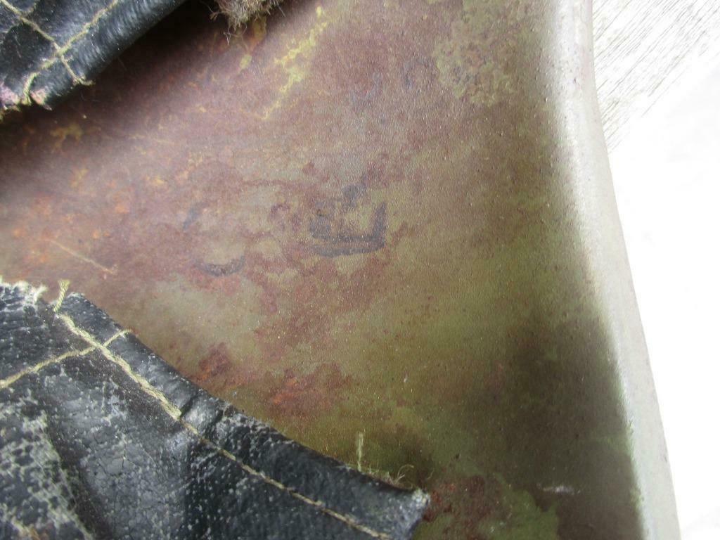 и еще один из признаков - это может быть звездочка, выбитая на козырьке с внутренней стороны, которая сразу переносит каску на военный период выпуска.