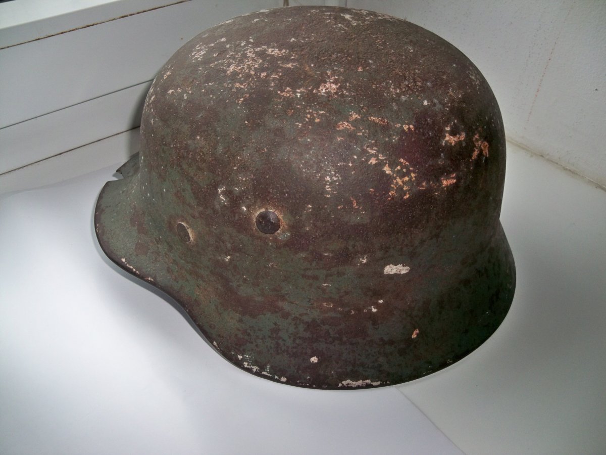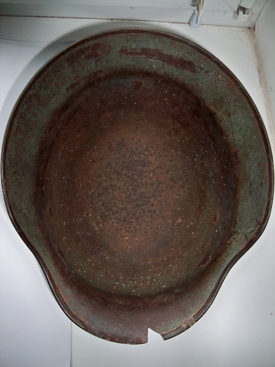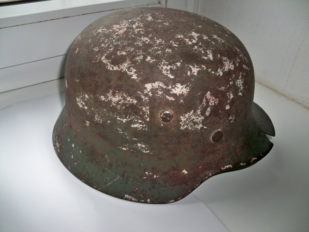 Хорошее состояние, не гнилой, вальц в хорошем состоянии, на каске просматривается нечастый, частично сохранившейся зимний окрас, хорошая каска не для реставрации, как антураж на полку в коллекцию, 1000-1200 гривен.