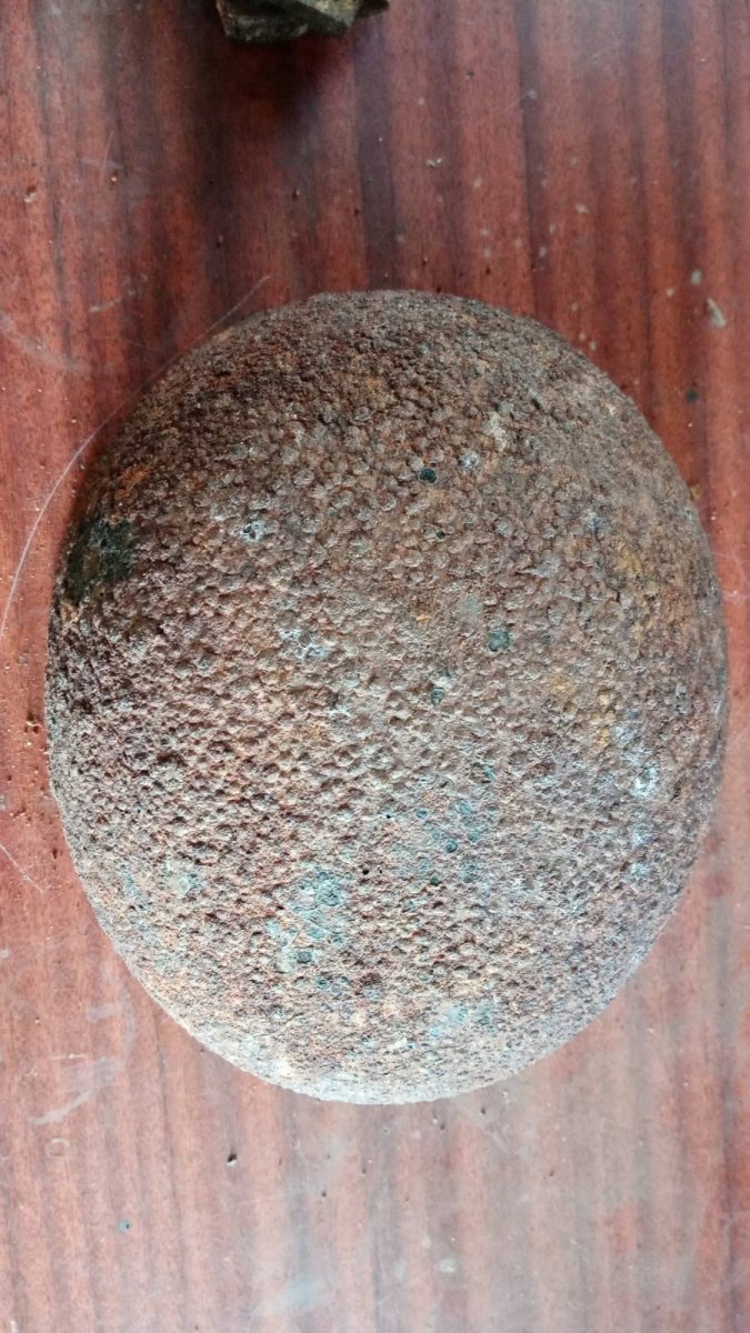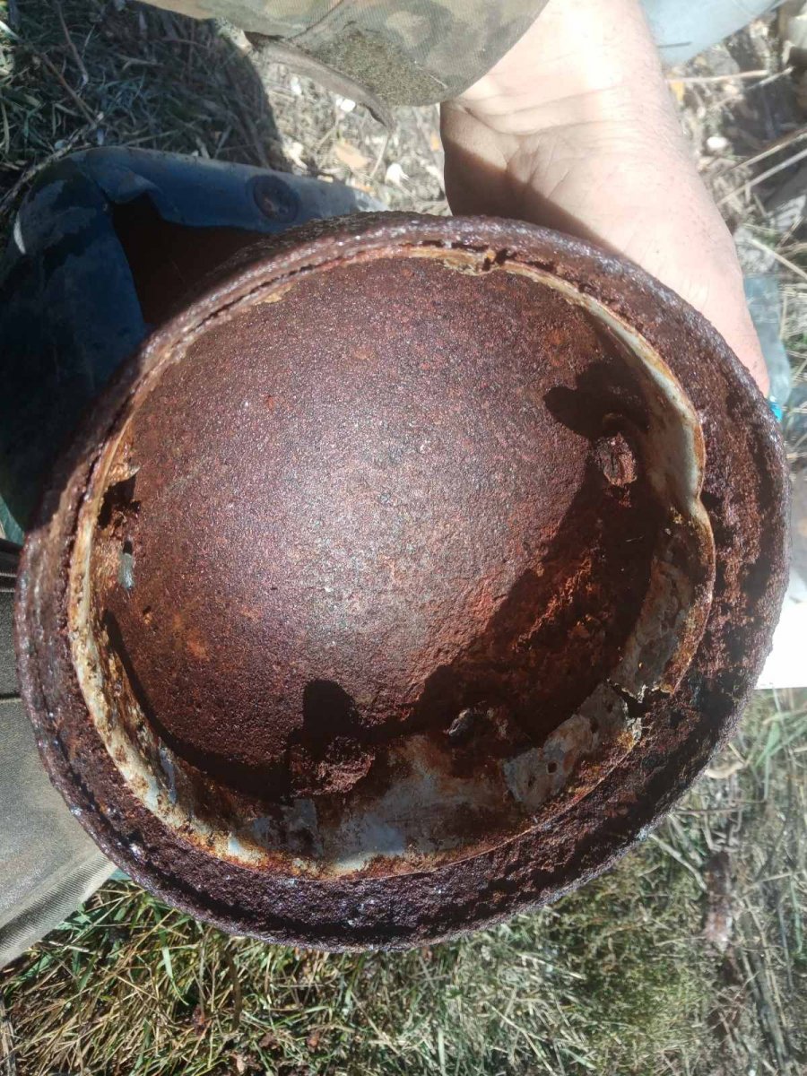 Исходя из вышесказанного, можно заключить, что шлем лежал в земле - кверху дырочкой. Снаружи вокруг пробоины свежие недавние сколы коррозии. Таким образом совершенно непонятно когда она образовалась и вследствии чего. Можно предположить, что во время откапывания был удар в эту область, а то что этот удар пробил стенку шлема, говорит о "рыхлой" структуре металла.