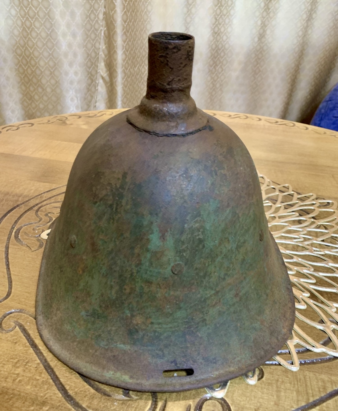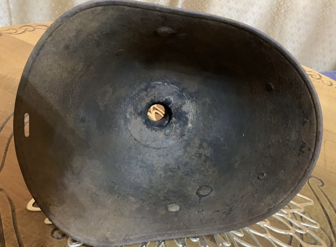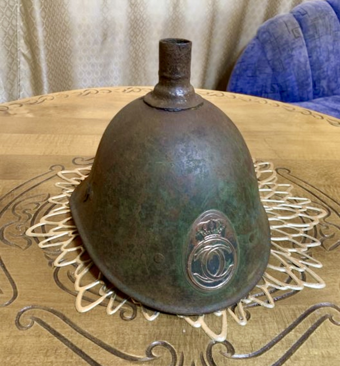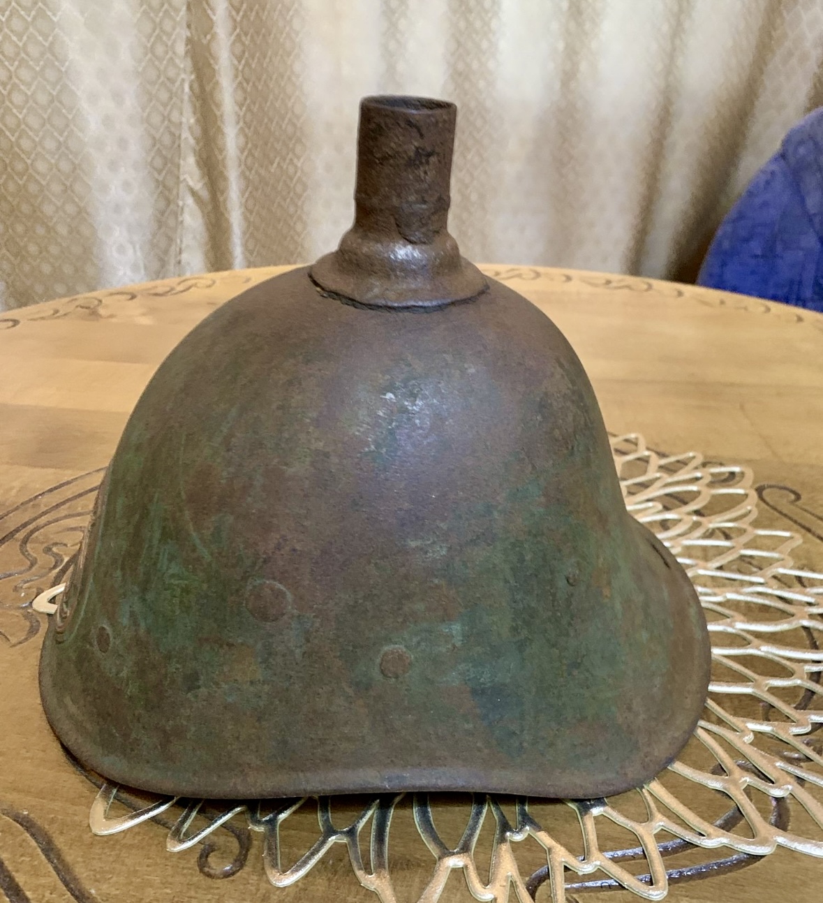 Доброго. Судя по заклёпанным отверстиям, можно предположить, что из румынского шлема сделали большую лейку для жидкостей.