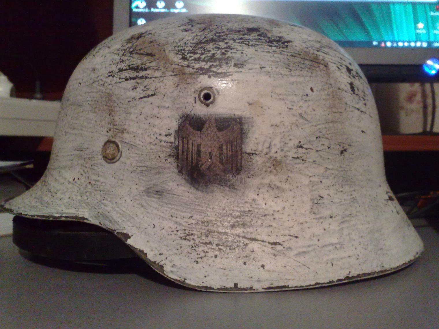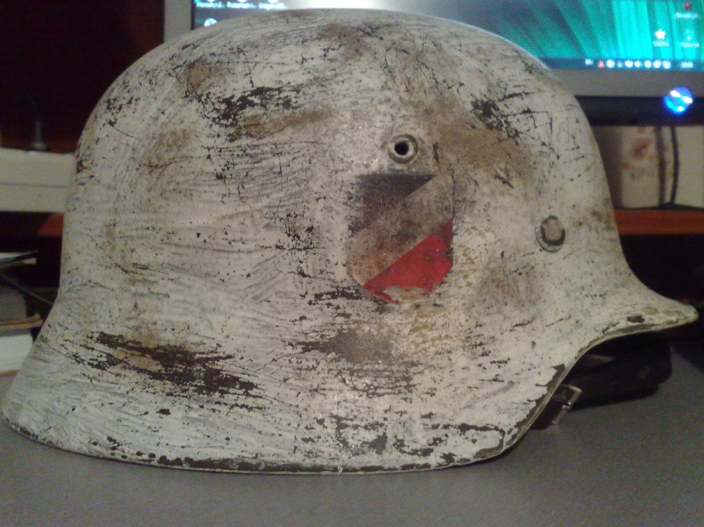 на зимні шоломи немає якогось стандарту кольору фарби,щоб можна було таке стверджувати (замало фарби,затемна).Зимовий варіант ,якій пролежав 70 років в землі може мати кольор від темно-сірого до яскраво-білого і кількість фарби залежить від стану шолома (як і кольор).є шоломи,де білої фарби залишилось 10%. Шолом зроблено добре і правдоподібно,просто так припало,що майже всі люди,які покищо відписалиль тут несподобали вашу роботу,але це неговорить про те,що шолом поганий.