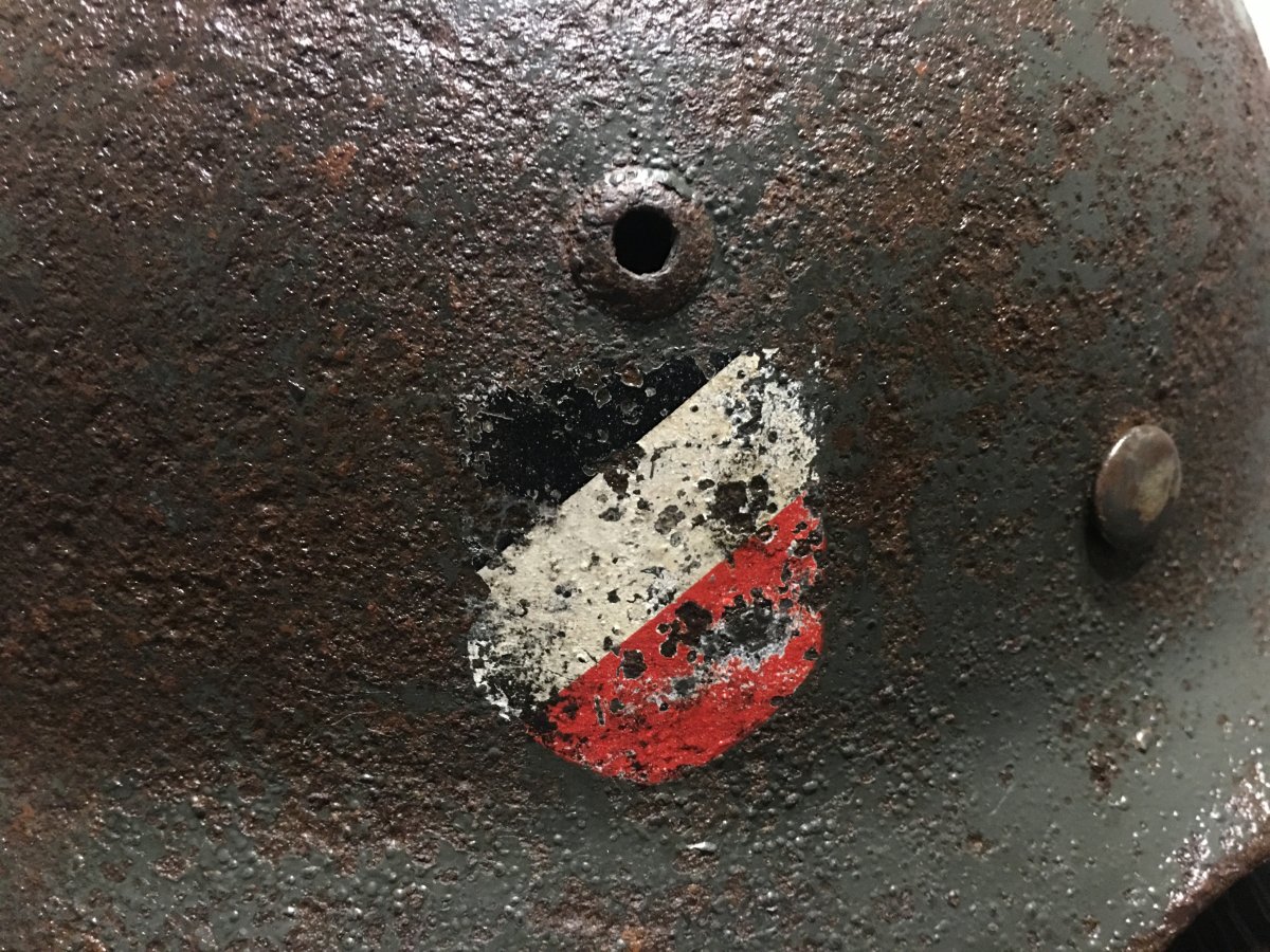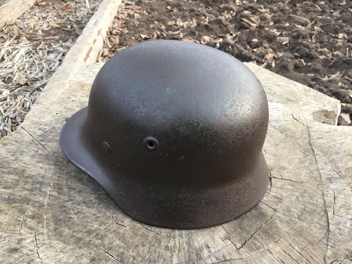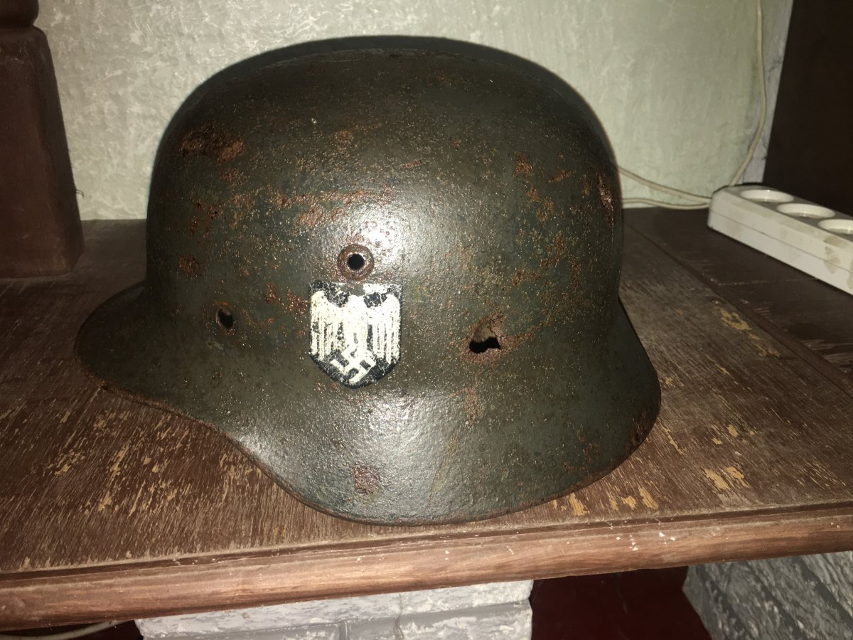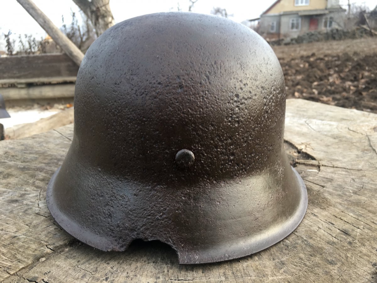6. Каска М-42. Очень антуражный шлем. 68 см. по кламерам. Осколочное пробитие у левого виска с выходящим в затылочной части o_O. Неплохой орёл, много краски. Клеймо ЕТ 6... Номер партии 1523. Крепкий большой колпак!