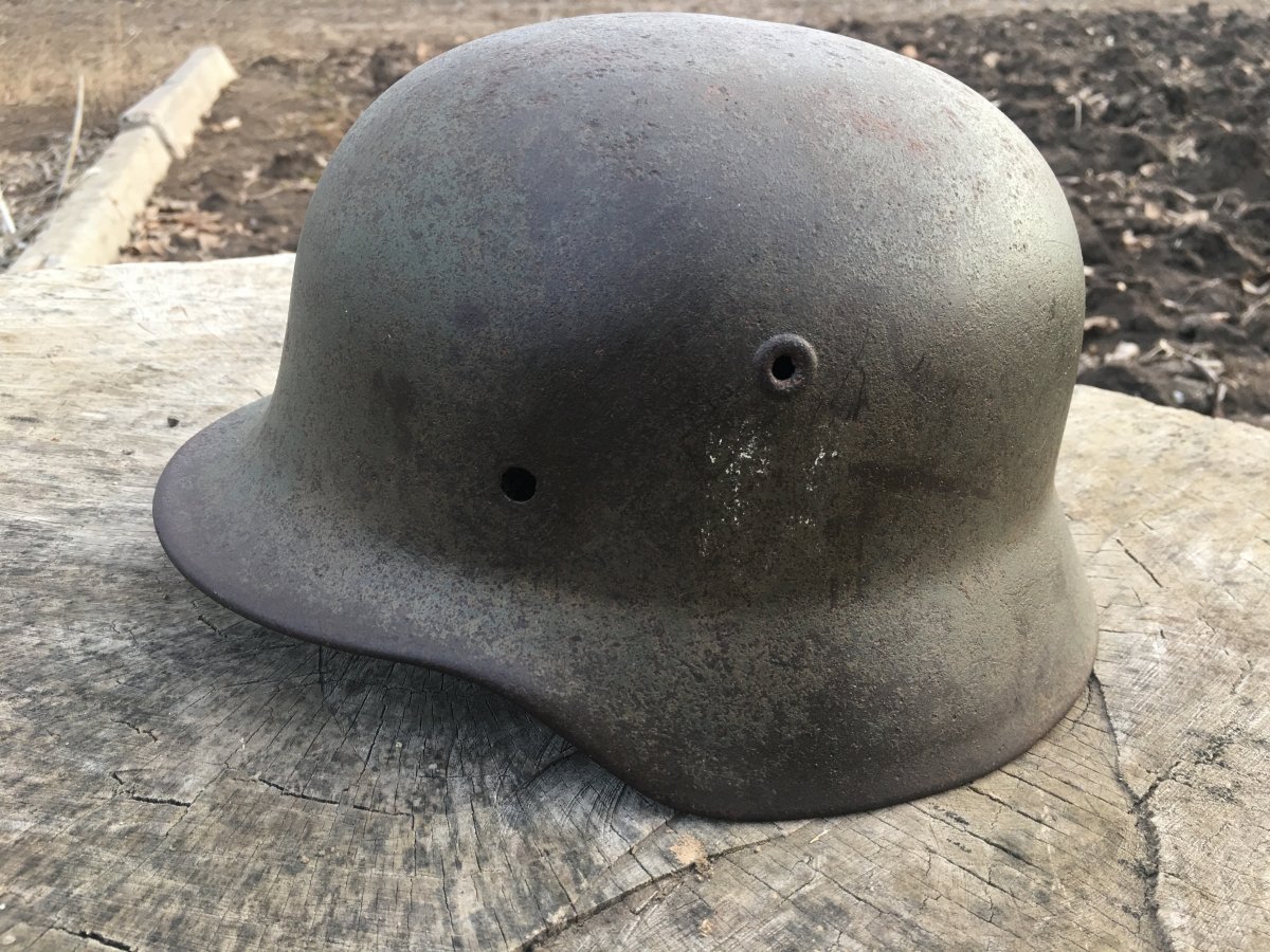 9. Каска М-40. Размер по кламерам 65 см. Клеймо NS 64 номер партии 1536. Остатки декали вермахт. Очень интересный цвет. Весь целый, ни трещин ни свищей.