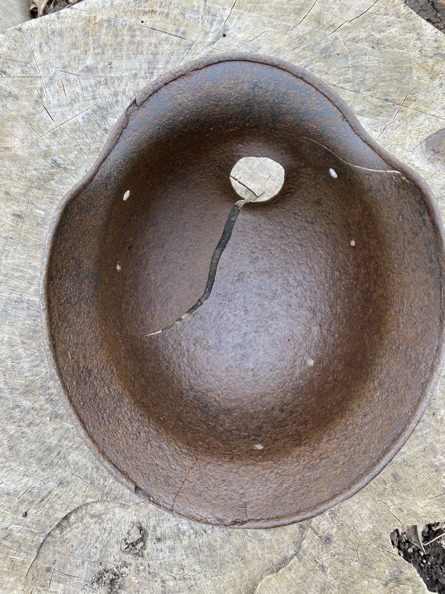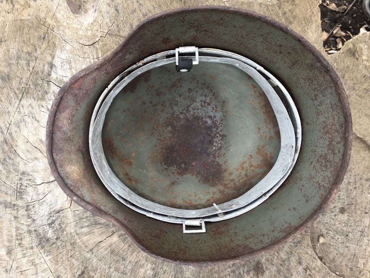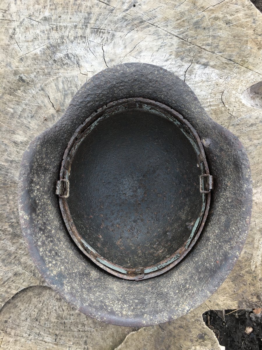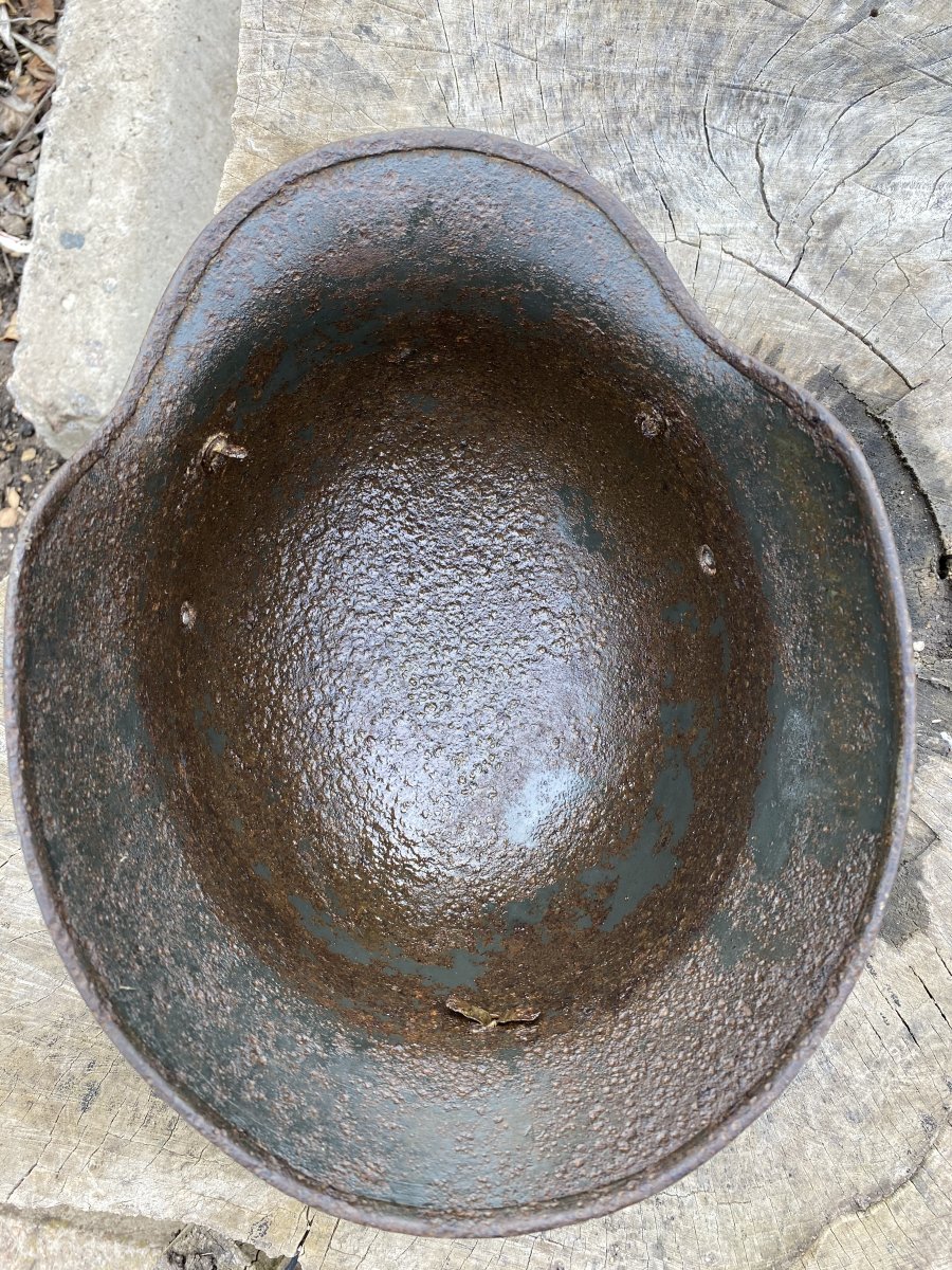11. М-35, двудекалка. Без отверстий трещин и повреждений. Размер по кламерам 66 см. 2 слоя фронтового перекраса хорошо просматриваются. Под ними остатки орла и триколора (счищать не стал, мне так больше нравится). Родной обруч подшлема, 2 кламера. Клеймо ЕТ-65(64)? Прошу, высказывайтесь по цене) По предидущем шлемам так же если есть что добавить, буду рад. С уважением.