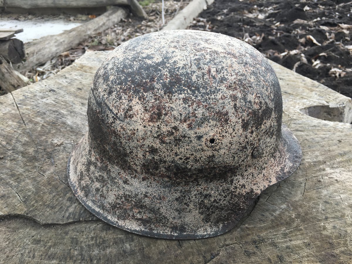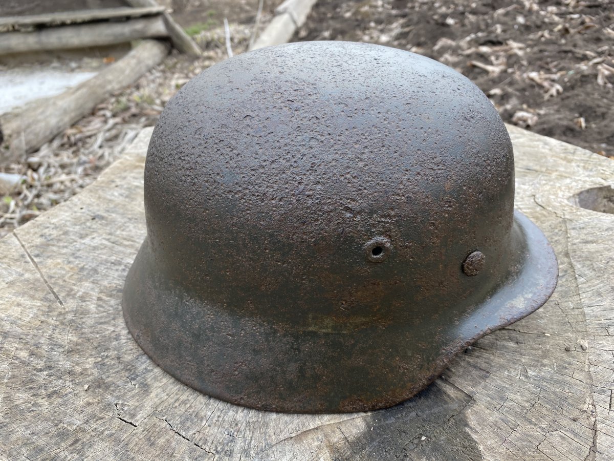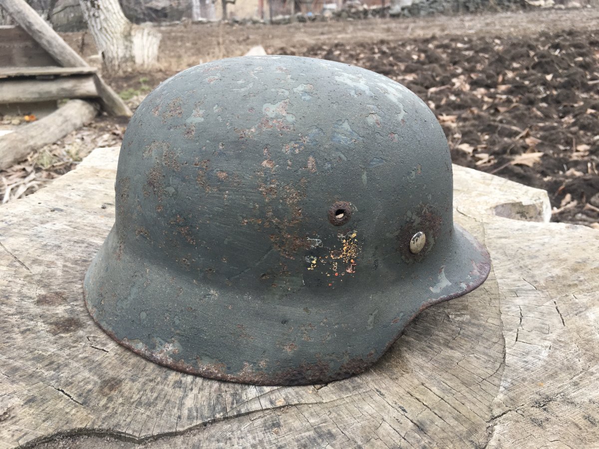 Здравия камрады! Ещё чуток) 10. М-35, крепкий тяжёлый шлем с антуражными осколочными ранениями. По кламерам 67 см. 80-90 процентов родного окраса. Декали увы нет. Вальц целый, кламера отсутствуют. Виден номер партии. Клеймо размера под краской.