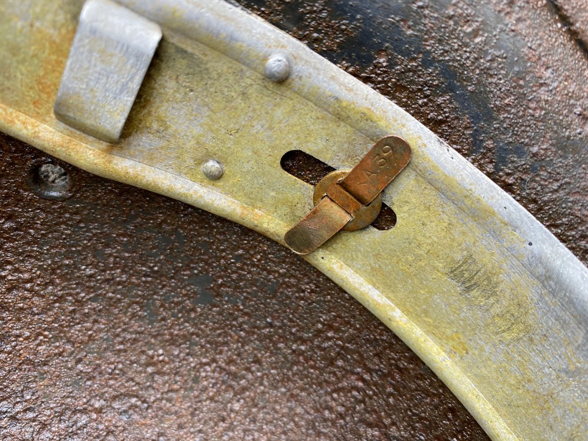 Едем дальше) 14. Каска М-35, была в перекрасе, после чистки частично ушёл. Размер 65см по кламерам. Краски много, повреждений нет, родной обруч и латунные кламера с клеймами КА-39. Остатки декалей под перекрасом, орёл практически улетел а вот триколор на месте.