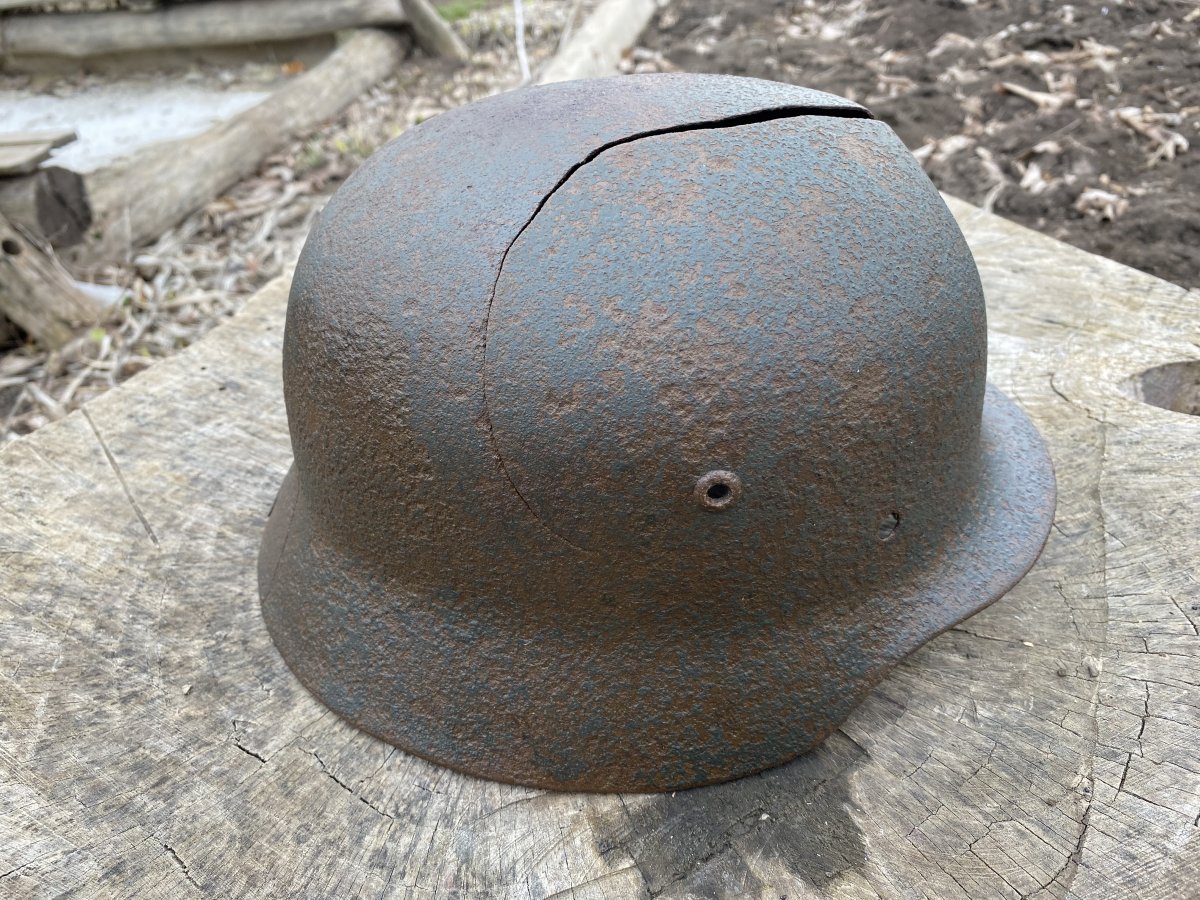 16. М-35, 67 см, по кламерам. Мега антураж)) Прямое попадание в лоб чего-то крупнокалиберного типа ВЯ 23 или что-то в этом роде, множественные повреждения в результате удара. Остатки окрасе и орла. При осмотре коллекции первый шлем на который обращают внимание))