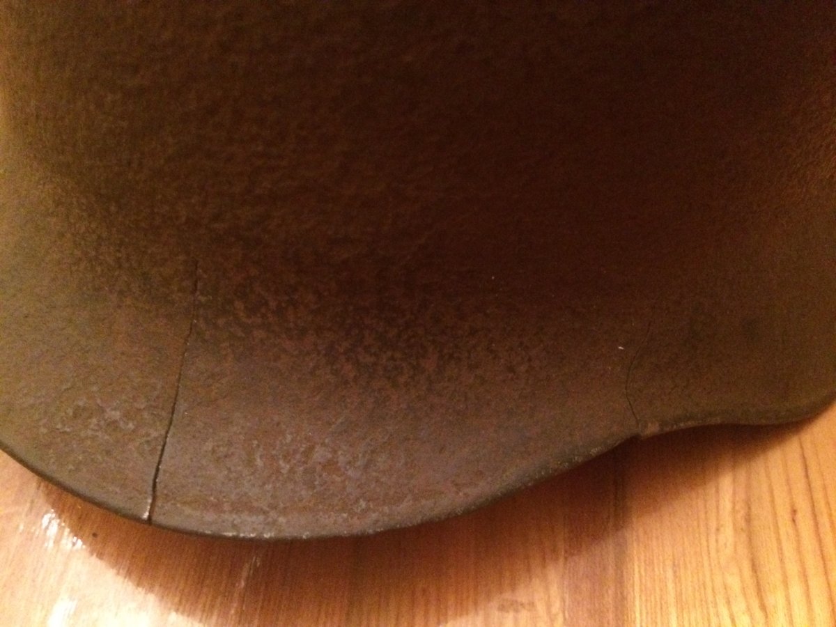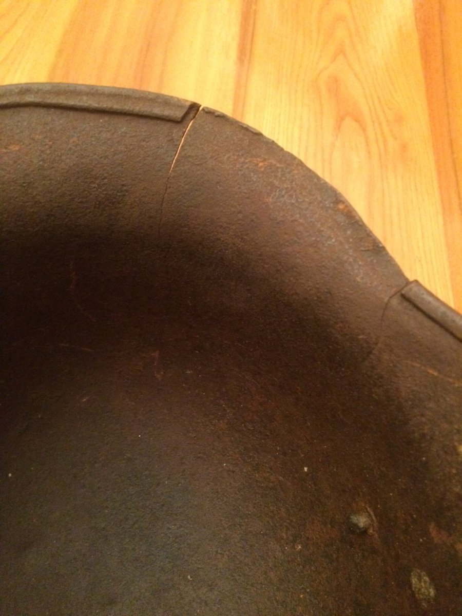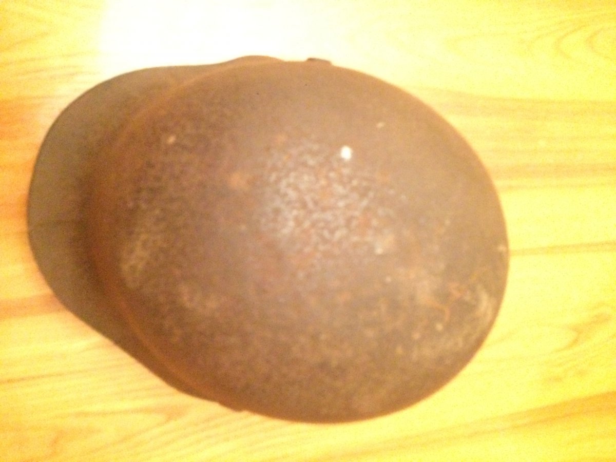 Даю фото каски що виставляється на продажу .Є дефекти-чогось зробили 3шт. закльопок,і козирьок каски має тріщини і нехватає куска ободка.По-фото все видно.А так метал на 4+ бо це некопане.