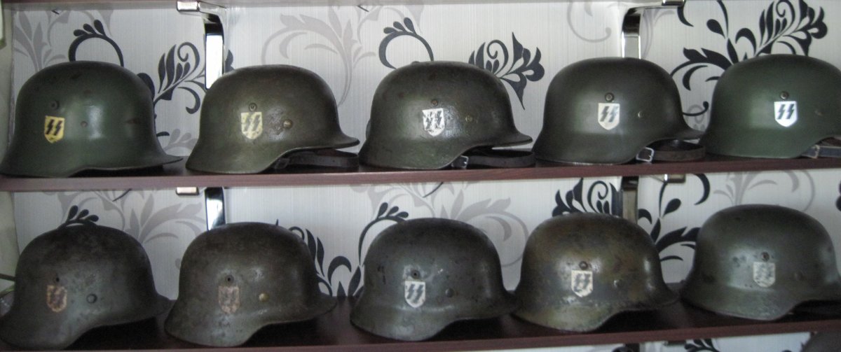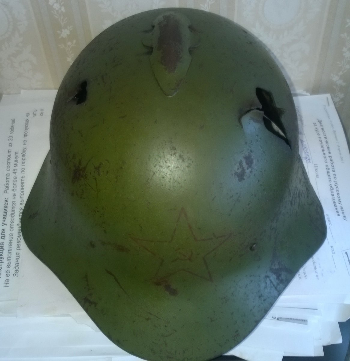 шлем м35 с позиций противотанкистов характерное пулевое для этой позиции,судя по всему работал снайпер,снимал всех,кто высунет голову из-за щитка 50 мм орудия внутрянка покрашена немцем под африку,на куполе было 2 слоя краски,под ней оригинальный зеленый цвет