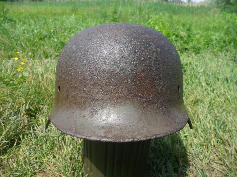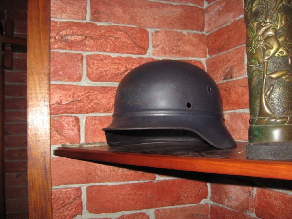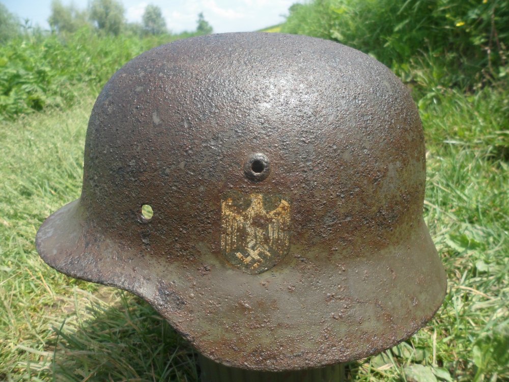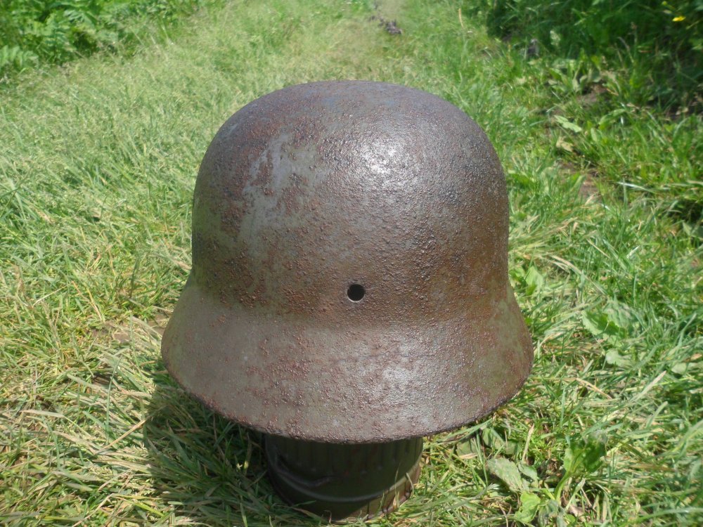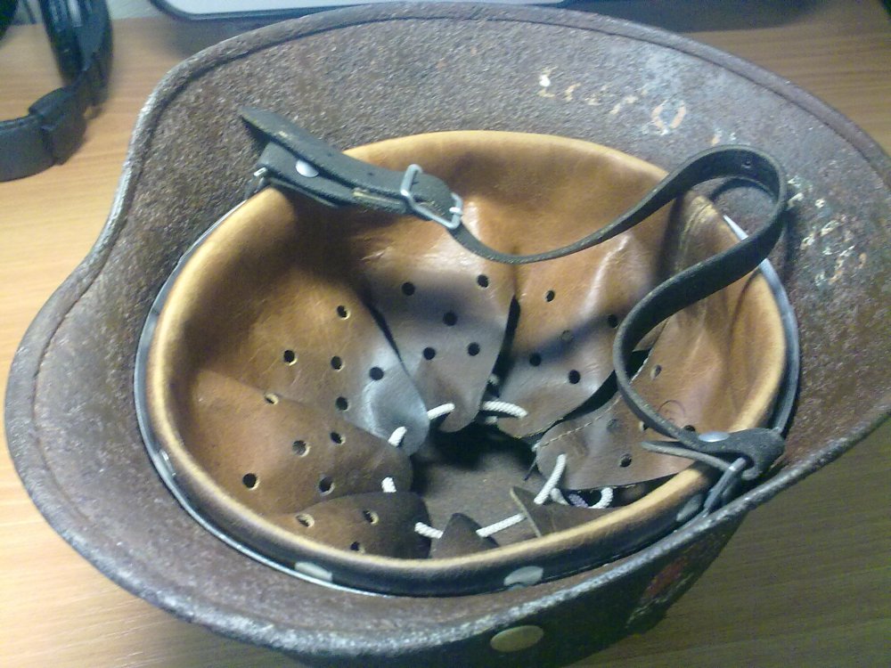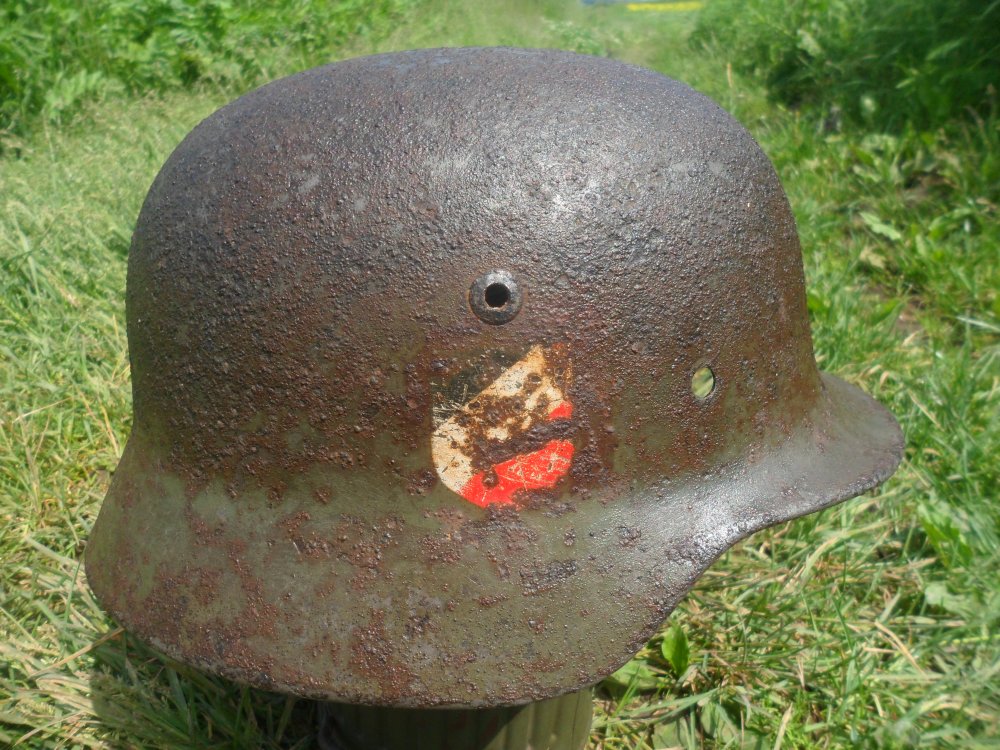 Моя красавица М35/64. Всё по классике жанра: двухдекалька, двойной фронтовой перекрас(курочка не закрашивалась, поэтому сохранилась хуже чем триколор),подпись хозяина. Вставил качественную копию подшлема на пружинах, обручи алюминий с боковыми усилителями, кламмера латунь. Глаза радует.