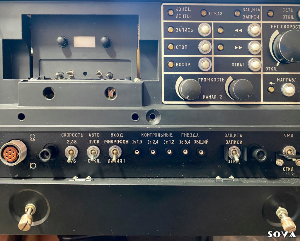 Судя по таким разъемам аппарат не бытовой. все управление не рычагами а электромеханика,что позволяет ввести полноценное дистанционное управление.(ДУ) не понятно зачем военным такое качество записи и такие навороты. Военным и Томь 407 за глаза хватило бы. Думаю если в кишки ему посмотреть то там будут все импортные комплектующие
