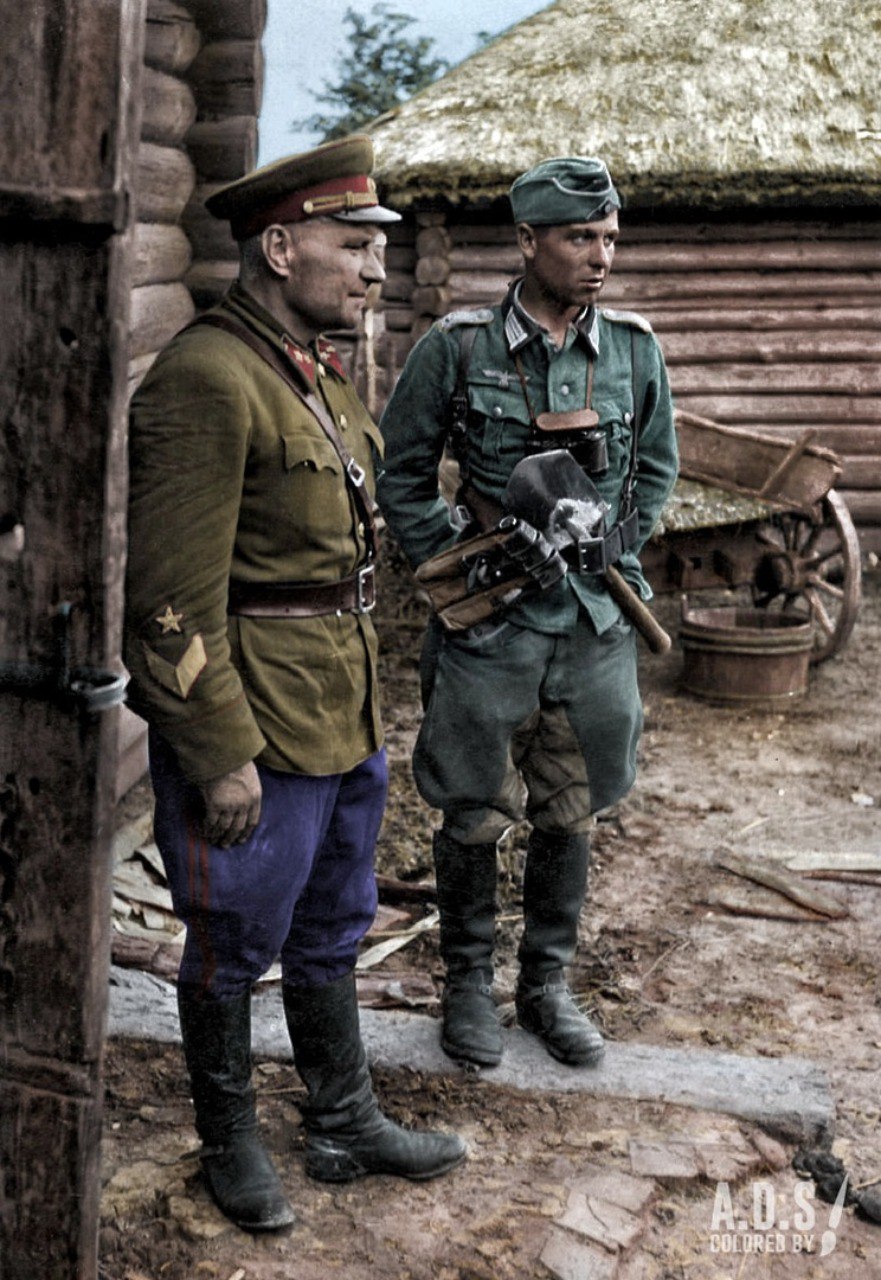 Командир 21 стрелкового корпуса генерал-майор Дмитрий Ефимович Закутный (1897 — 1946) в сопровождении немецкого лейтенанта из 110-го пехотного полка (Infanterie-Regiment 110) 112-й пехотной дивизии (112.Infanterie-Division) вермахта вскоре после сдачи в плен. Д.Е. Закутный — генерал-майор РККА, с 23 июля 1941 назначен командиром 21-го стрелкового корпуса в составе Западного фронта с должности начальника штаба корпуса вместо генерал-майора В.Б.Борисова, погибшего 30 июня при выходе корпуса из окружения. 26 июля под Гомелем 21 стрелковый корпус был окружен повторно. 27 июля в районе посёлка Большая Зимница, юго-восточнее Быхова, командир корпуса Д. Е. Закутный попал в плен. На первых же допросах выразил готовность к сотрудничеству с немцами. В августе 1944 года Закутный был откомандирован в распоряжение Власова и включился в работу по созданию «Комитета освобождения народов России» и подготовке «Манифеста КОНР». Отвечал за агитацию и вербовку добровольцев в РОА. 20 мая 1945 года в городе Фюссене (Германия) задержан немецкой полицией, созданной американцами, и помещен в тюрьму. 13 июня 1945 года Закутный был передан американской стороной советскому командованию. 1 августа 1946 года Закутный был приговорен Военной коллегией Верховного суда СССР к смертной казни. Повешен в тот же день вместе с генералом Власовым.