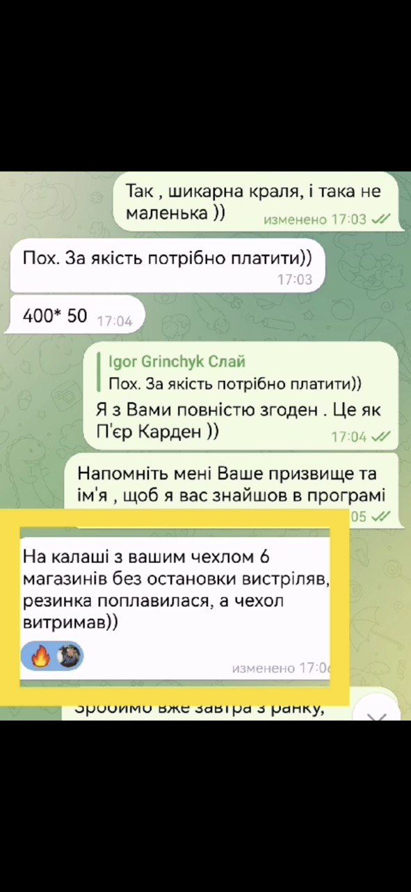 Вот обратная связь по качеству кавера от бойца с нуля . Пишет - 6 рожков подряд из АК 74 и чехол остался в идеальном состоянии , правда резинка которая стягивает сверху немного поправилась . Заказал ещё один кавер для другого своего девайса . Резинку на замену выслали в подарок .