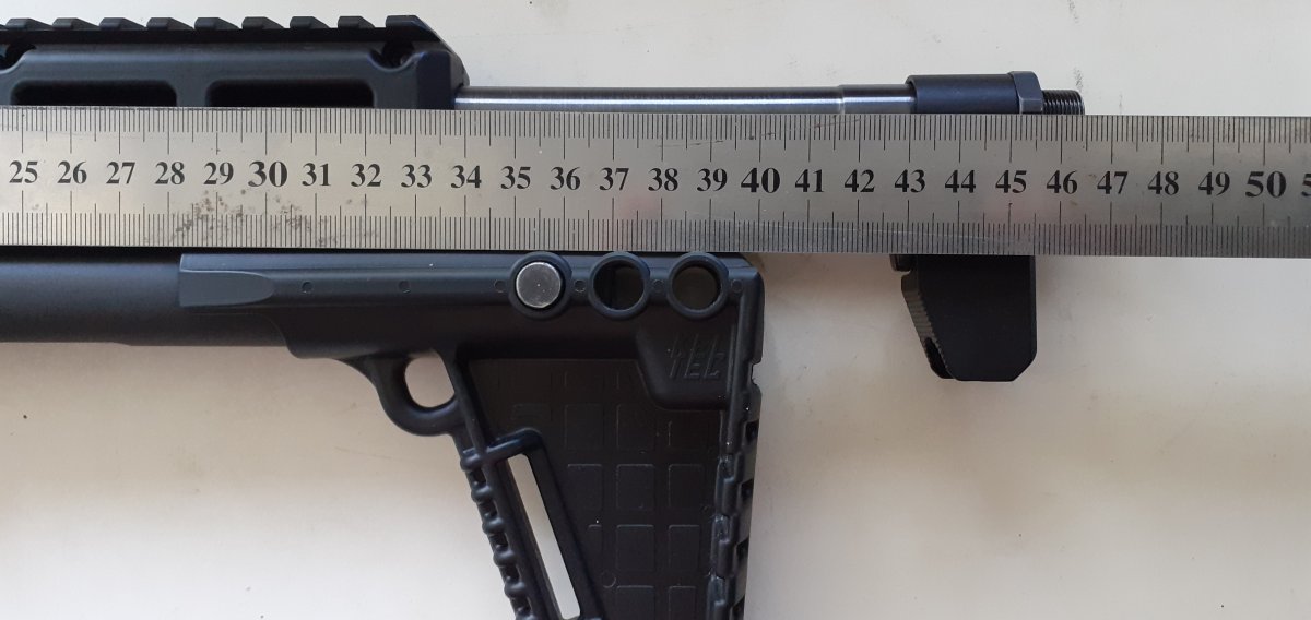 Нашел уже. Длина оригинального Кел-Тека в сложенном состоянии 16,1" (409мм), в боевом - 30"(762мм). Методом обратных вычислений получаем длину приклада 762-409=353мм Теперь, если к нашему стволу прибавить приклад, получится: 470+353=823мм. Это минимальная длина карабина, поставляемого в Украину. Укорачивать ствол смысла нет! Разве что, с перспективой установки постоянного ДТК/ПБС.