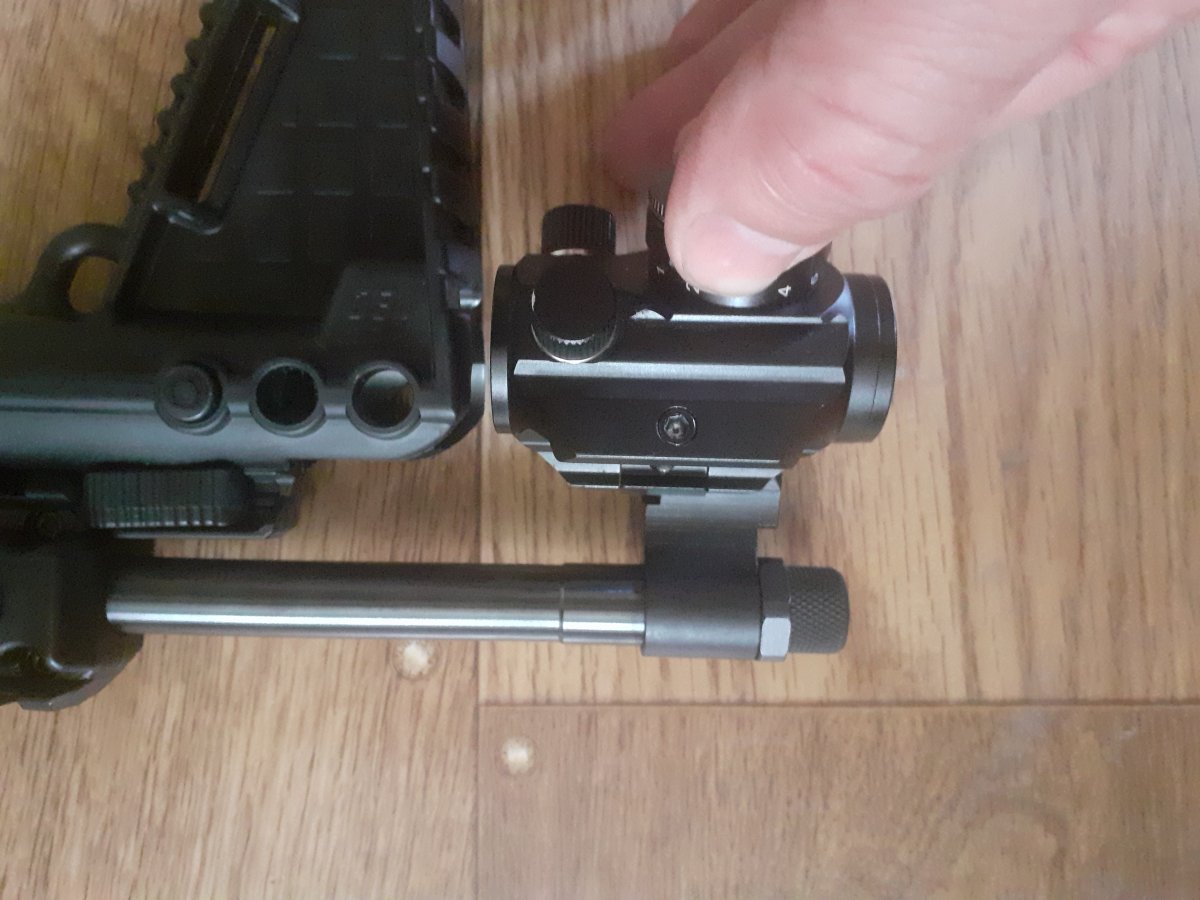 Примерял временную угловую ручку и старый коллиматор Бушнел ТРС-25 + маут 3/4'. Высота получилась над диопртом, примерно 34 мм над планкой вивер, родные примерно 31 мм. Возможно стрелять как через карлик так и с родными, некоторым надо будет поиграться с высотой маунта. С высоким райзером 41 мм родных прицельных мне не видно. С высоким 41 мм мне не видно прицельных. С открытым валиком надо потбирать маунт, складывается будет примерно так.