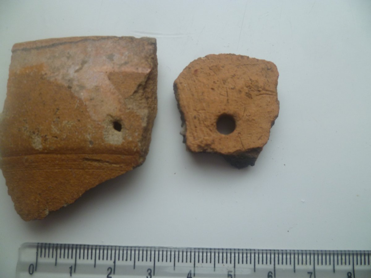 Знаходив черняхівські горшки з відколотим фрагментом,то на горшку та шматку були симетричні отвори,коли я шнуром скріпив шматок з тілом горшка,то він досить міцно тримався,якось так.Думаю ремонтні отвори.