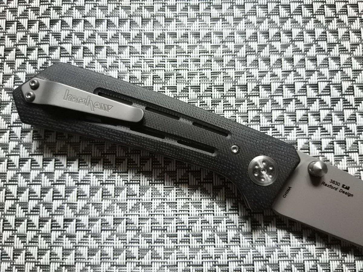 Рукоять Kershaw Injection 3.5 составляют стальные лайнеры, облачённые в накладки из G10 с 3D обработкой. Рукоять ножа имеет эргономичную форму, в руке не скользит, отлично удерживается как прямым, так и обратным хватом. «Премиальности» в облик ножа добавляют детали: продольные пазы плашек рукояти с отверстиями вытянутой формы, декоративные шляпки осевого винта (регулируются стандартным «torx»), интересно выполненный спейсер с выемкой и втулкой на которую удобно крепится темляк. Удобная клипса Kershaw Injection переставляется в два положения для правши и левши.