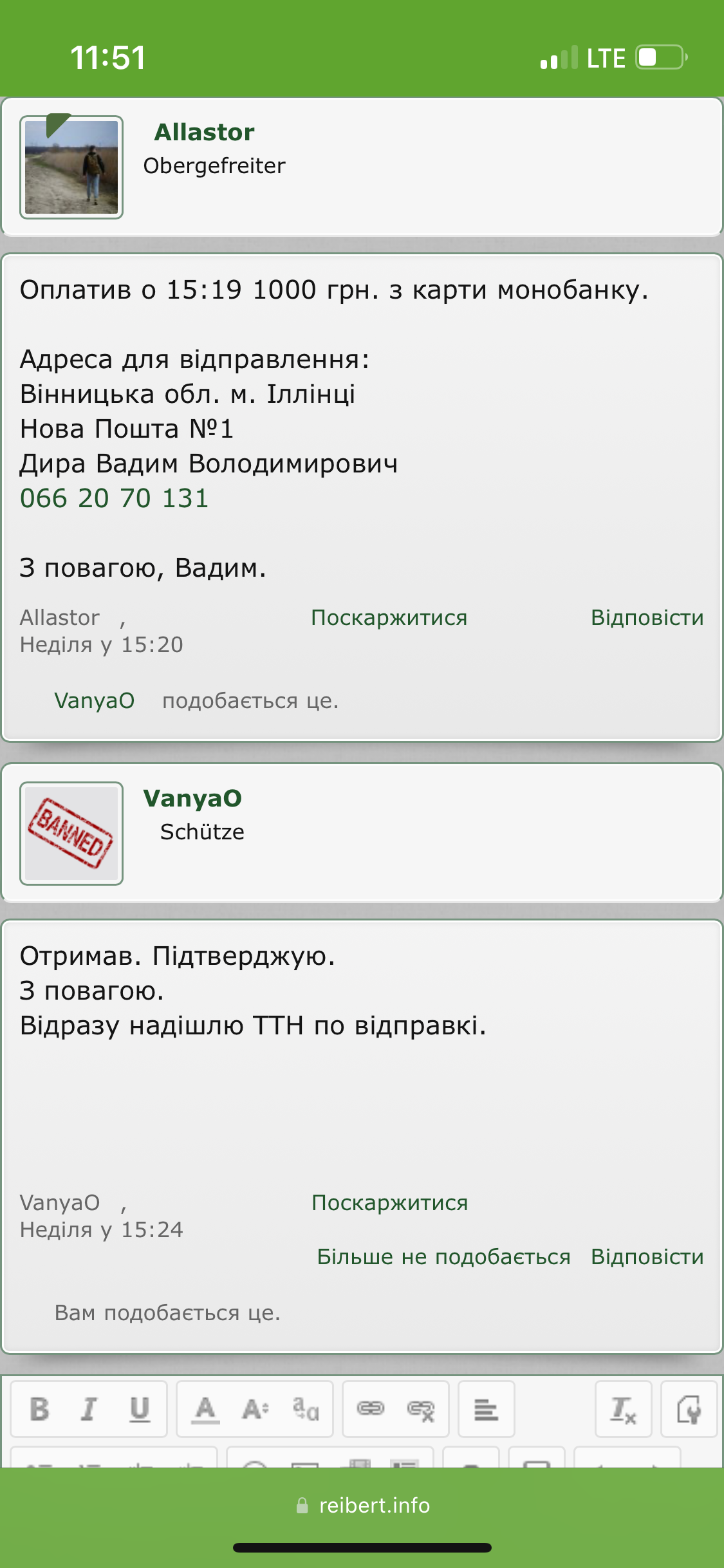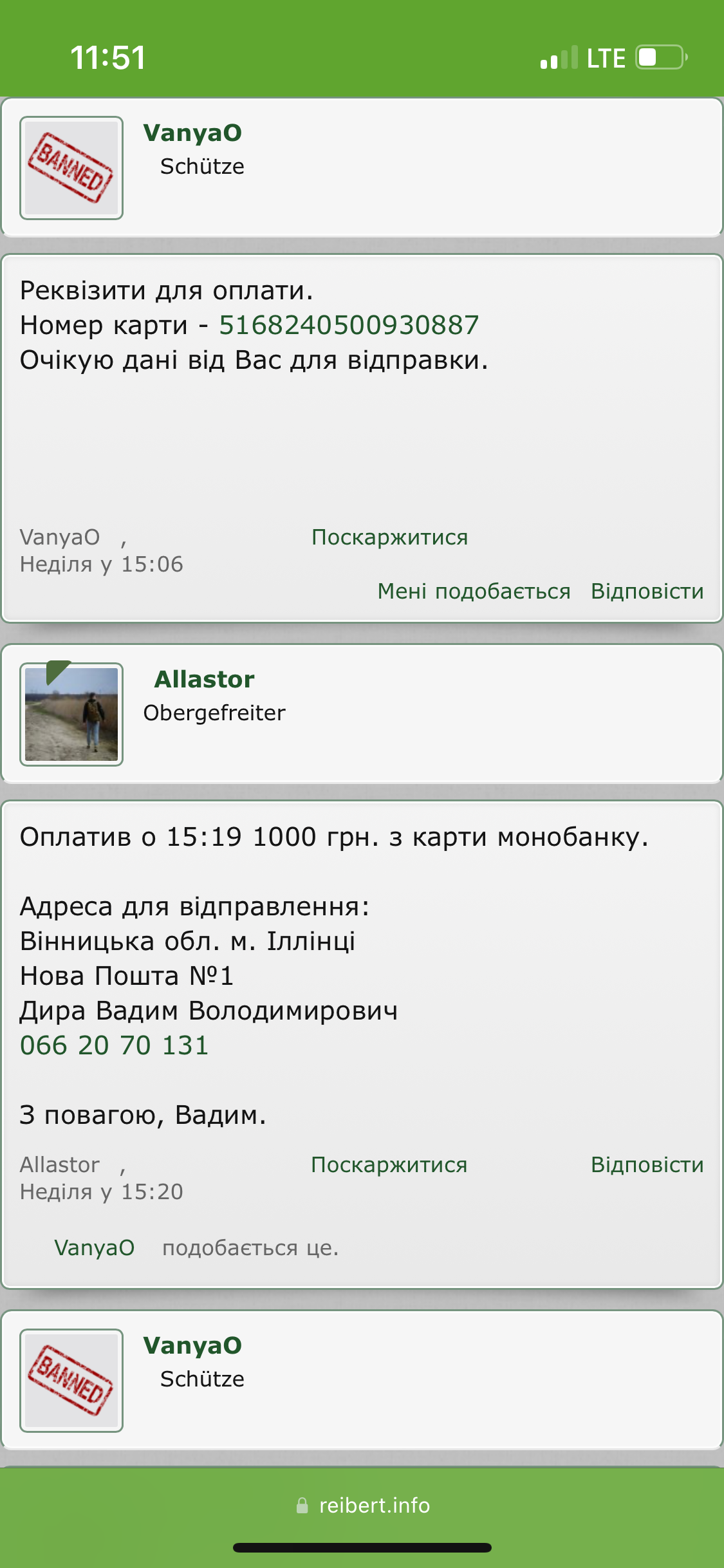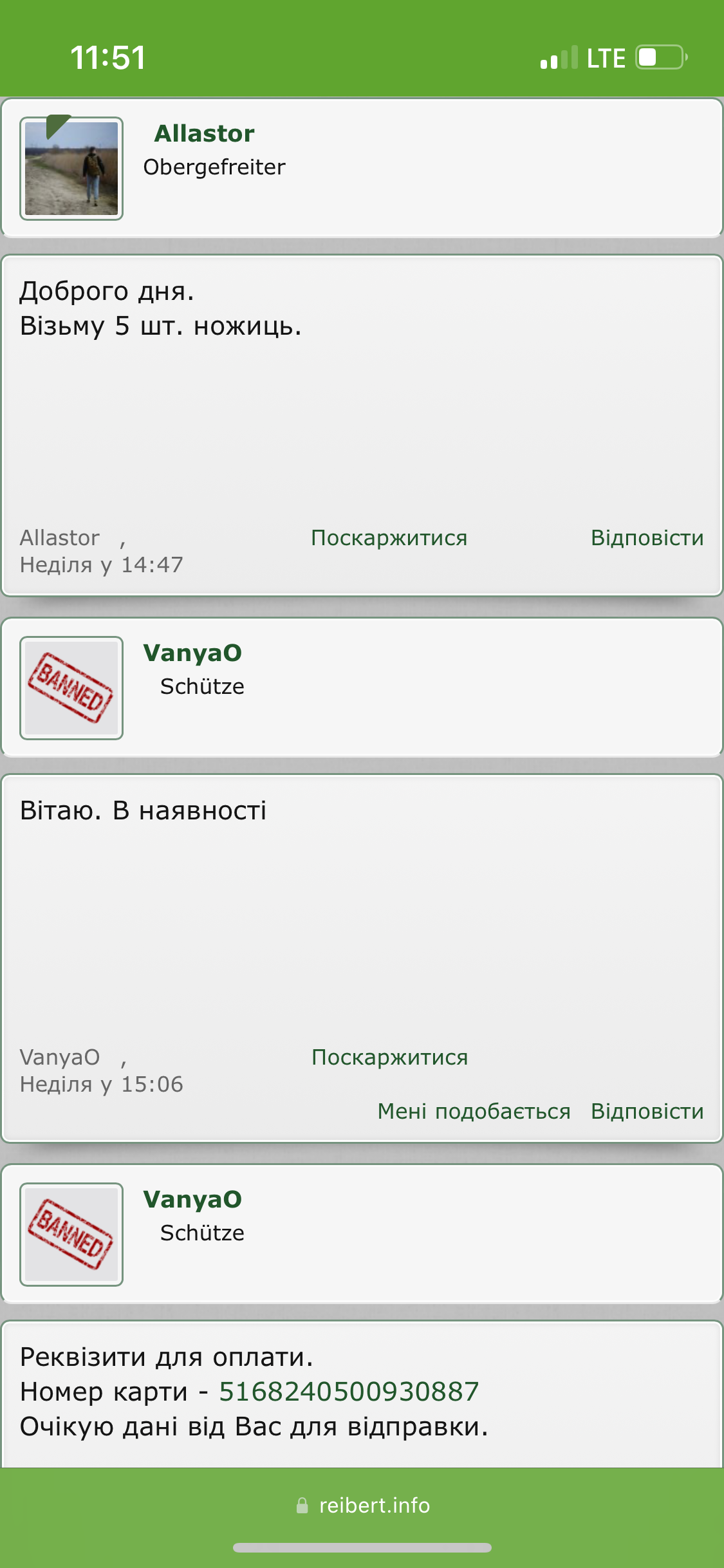 Вітаю комради, ось ця тварина(перший скрін) кинула мене при купівлі атравматичних ножиць на 1000грн. Його номер карти - 5168 2405 0093 0887. У нього ще було як мінімум дві теми продажу медичного спорядження, турнікети та бандажі, якщо не помиляюсь. Заяву до поліції написано, карта у нього приват банк, тому шанси знайти досить високі. Хто також попався на цього мудака, відписуйте у темі. P.S. Однозначно моя помилка, що я не перевірив акаунт продавця і не замовив наложкою, так як акаунт нулячий. Але шахраїв потрібно карати, особливо тих, хто кидає волонтерів та військових під час війни! Слава Україні!