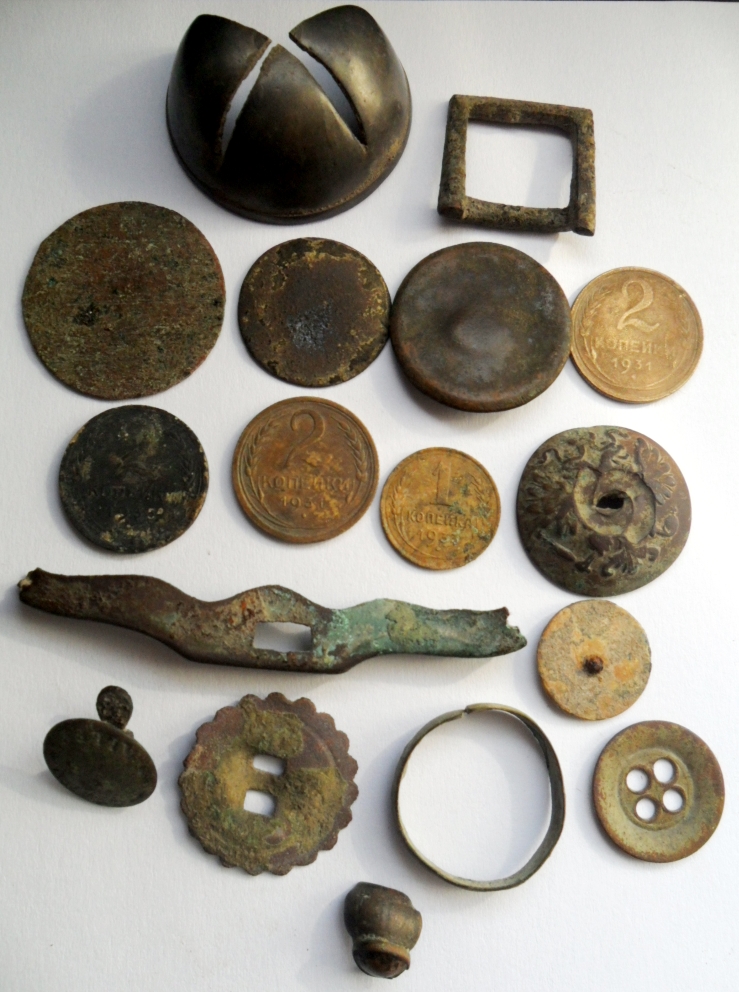 Сегодня на пару часиков заскочил по дороге в лес, между Леточками и Крехаевом. По находкам вообще печально, а точнее никак ))) Немерено хлама, совдеповских пробок и фольги. Пяток гильз, пуль, пара патронов, две военных пуги с рубашки и 20 копеек 1990 года
