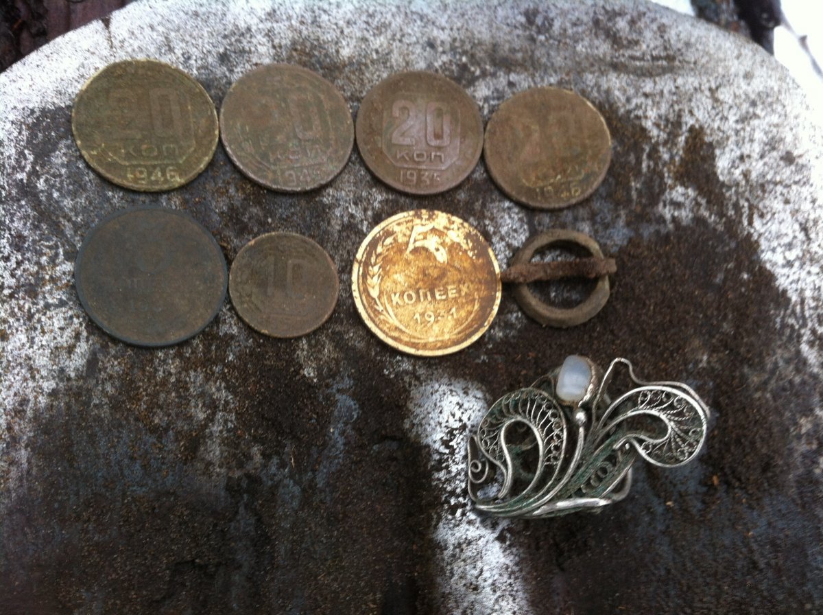 Нема питань. На світлині ще відсутній натільний хрест 1880-1890 року, десь його поклав... Це за осінь, приблизно 15-20 копів було на вихідні, не дуже агресивних, бо переймався що фляжка протече і віскарь зникне задарма... При мені камрад знайшов срібні 50 копійок, ще совєтські. Ще казав білони бували, я сам їх не бачив, але товаришу вірю, бо каже, що зовсім мало, десь 1-2 на рік. Тільки не смійтеся, будь ласка, я всього з весни копаю, влітку у спеку ніц не виходив (дохтури сказали, що мені копати при температурі більше 25 градусів то є западло). Квазара почав розуміти тільки восени, так що не переймайтесь, там ще є. Але все ж дуже хочеться жовтого металу хоч трохи здибати, мені багато не треба, кіло-півтора вистачить на сезон...