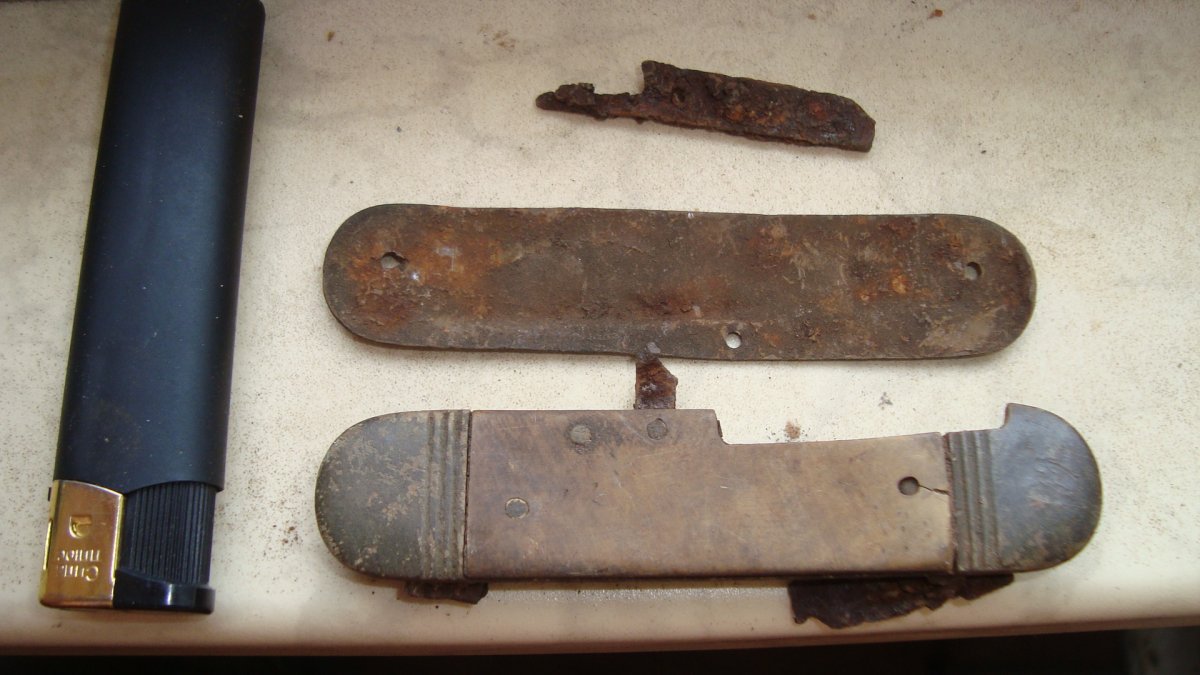 .....Закончу по находкам. Зажигалка , наверное по ПМВ. Клеймо интересное..Жаль, лопатой тесанул.КАК ВСЕГДА!!!!!! Одно наверное, из мест не далеких, второе алюм . Половинка ножа.Ну и