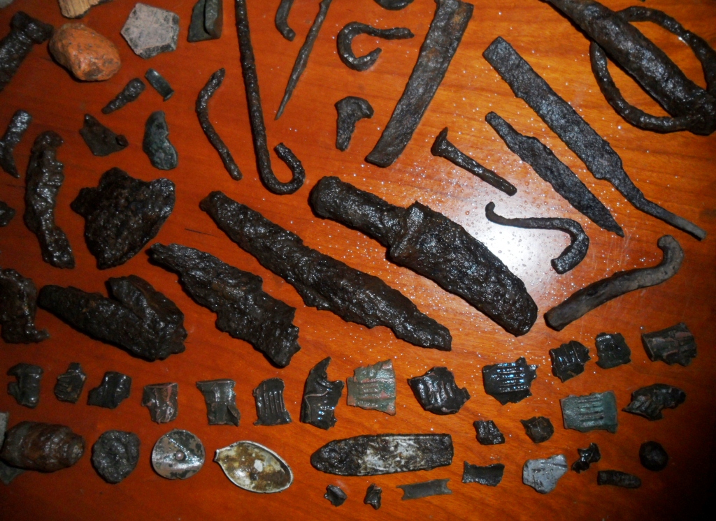 Сегодня недалеко от Киева нащупали с камрадом небольшую поселушку Киевской Руси. Он копал только цвет. А я выбивал все под ноль, полностью все даже черные сигналы. Ниже на фото все мои находки. Среди них порадовали крестики, жаль только что не все целые, пряжки, часть накладки, кованные гвозди, ножики, черные наки, приятная монетка серебришко и прочая жбонь. Всем камрадам хорошего вечера и приятных сигналов под катушку!