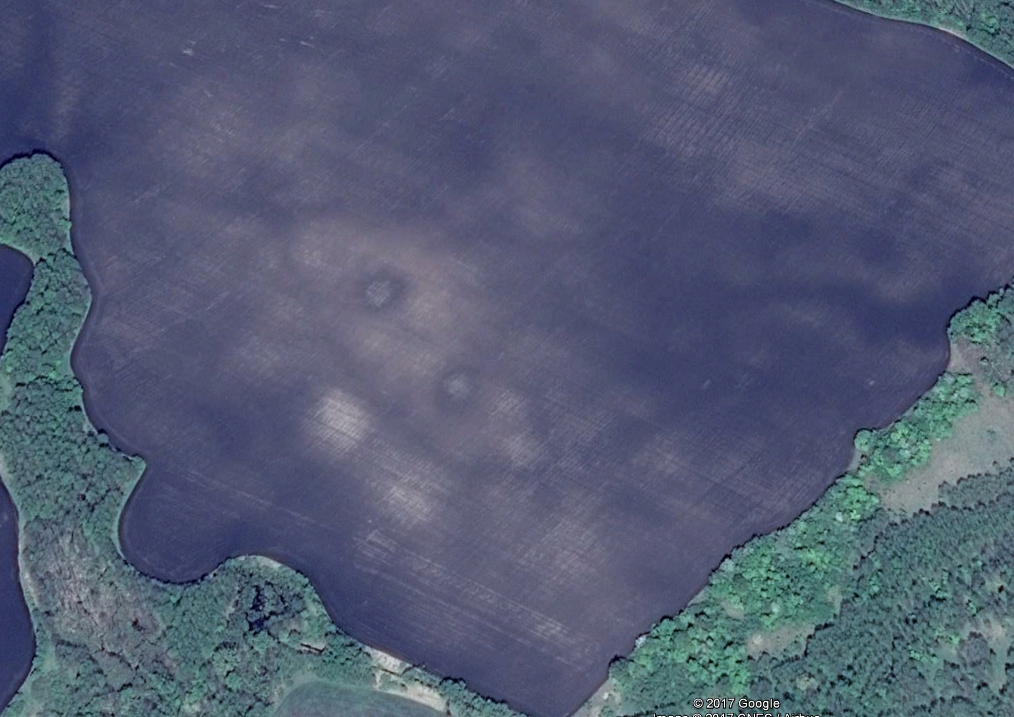 Не зная местности тяжело сказать... что это за два глаза.. это могут быть останки курганов.. либо же две нефиговые бомбы подняли нижний грунт, который светлее верхнего чернозема.