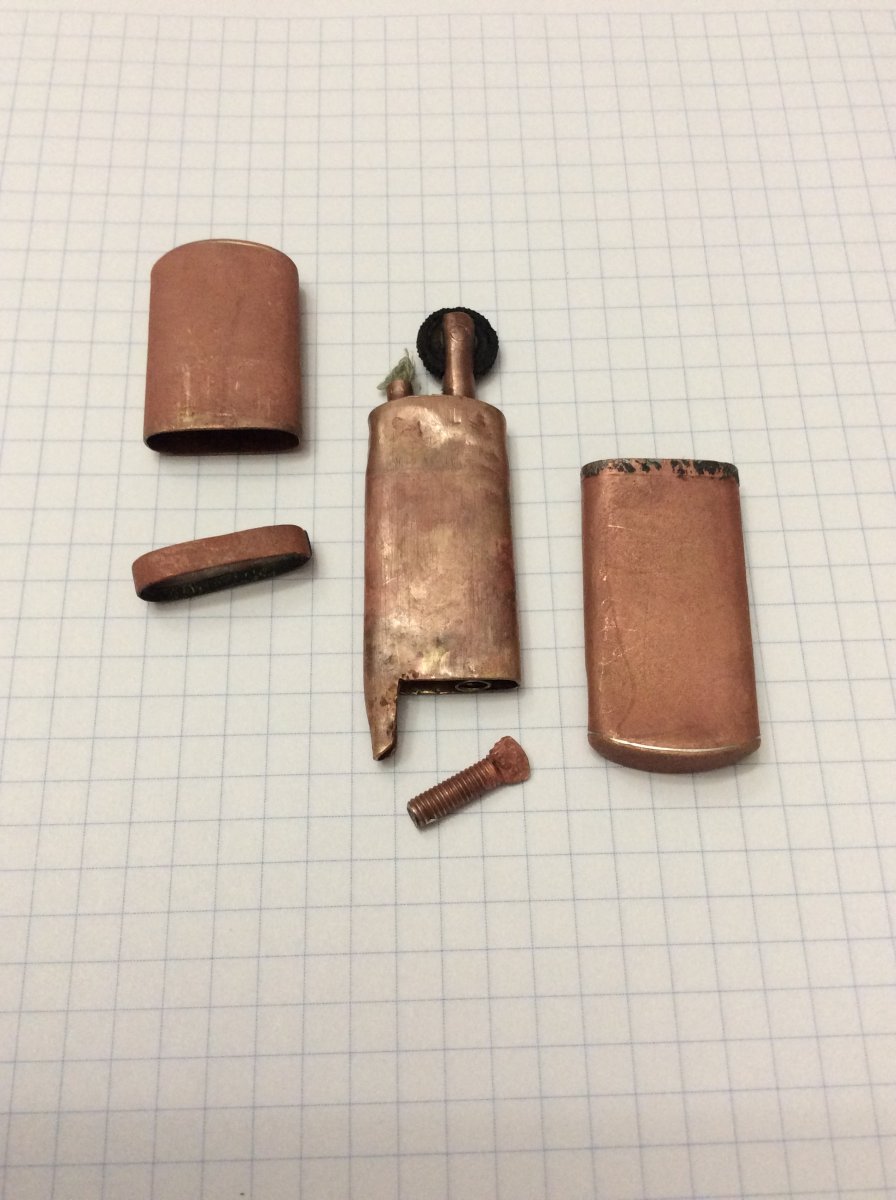 Вот такое чудо нарыл (я так понял по ПМВ), колёсико крутит как новое, подскажите как тут до пружинки добраться и заменить кремень? Хочу заставить функционировать Родной фитиль и войлочный наполнитель стоят родные ))