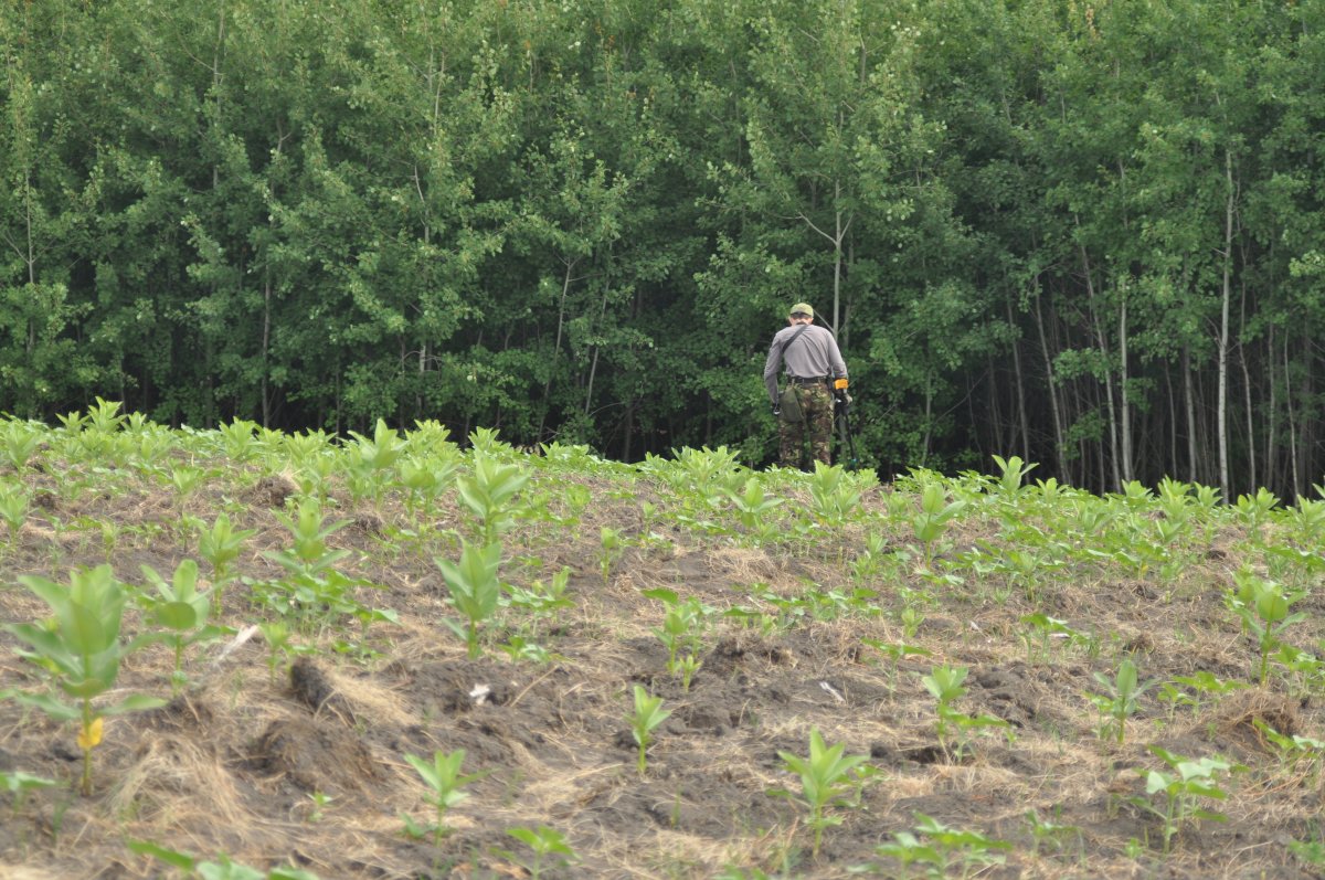 СвЫнство было бы оставить его до "новых веников". Даю голову на отсечение, что если бы любая группа копачей, которые путешествуют толпой на выходных в поисках артефактов, срисовала бы это место раньше нас, никто бы особо с ним не церемонился, ямы бы не закапывали, мусор с поля бы не убирали. Мы там как у себя дома, поэтому поддерживаем порядок. Ещё раз акцентирую внимание - посевы пострадали минимально, хотя у нас была просьба от хозяйки всё там уничтожить. Это не пшеница, где каждый шаг давит по десятку ростков. "Чёрный Фермер" действовал быстро, ночью и на шифрах. Поэтому не был соблюден весь процесс посевной, половина поля под "табаком КР":