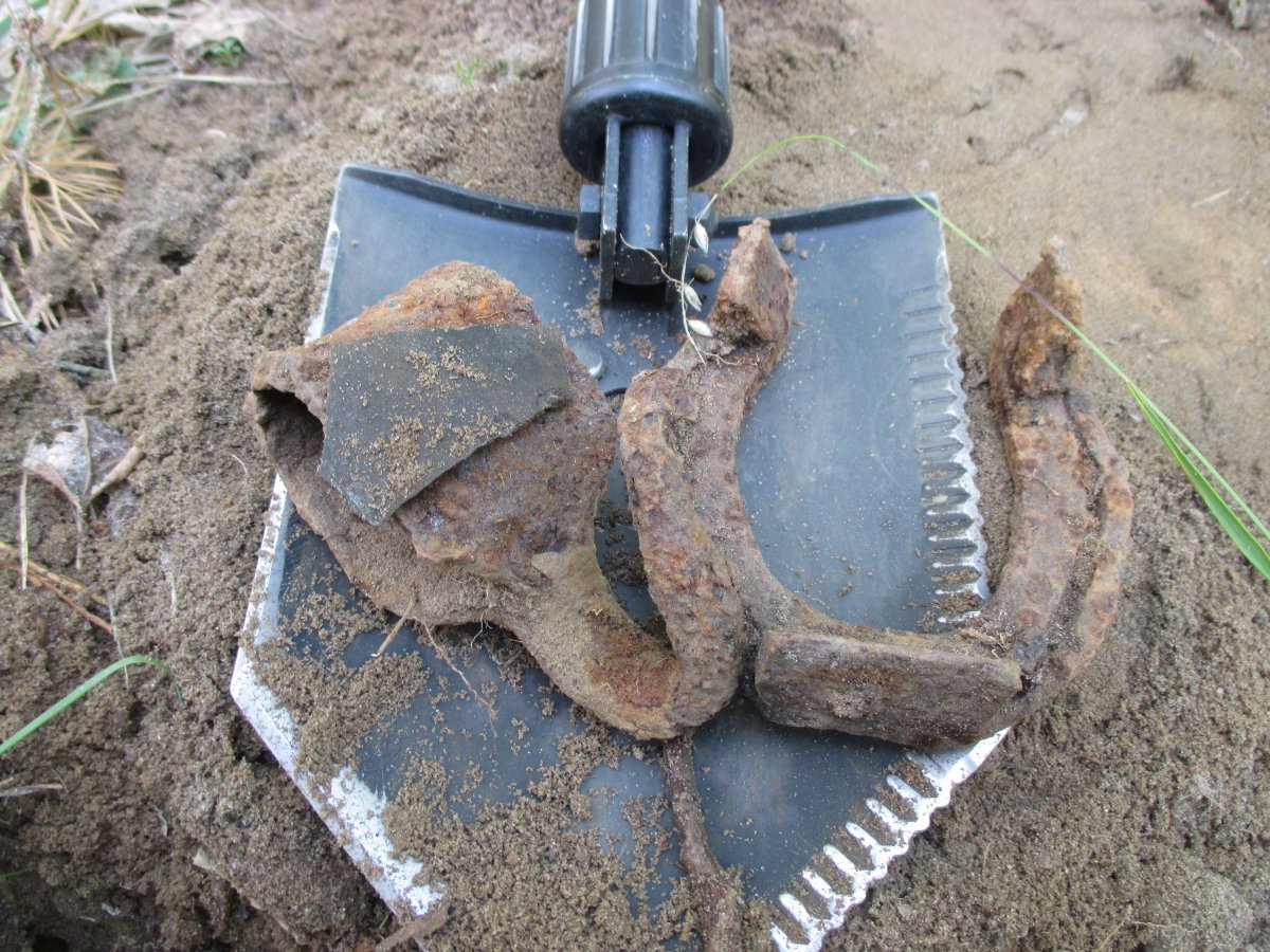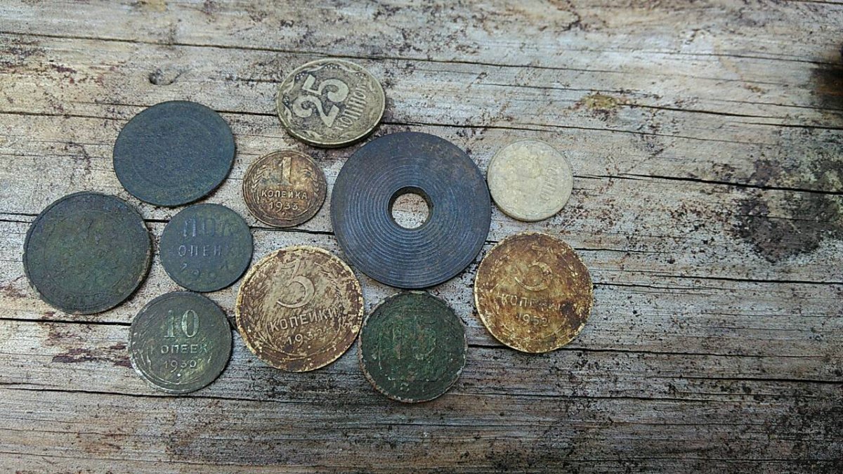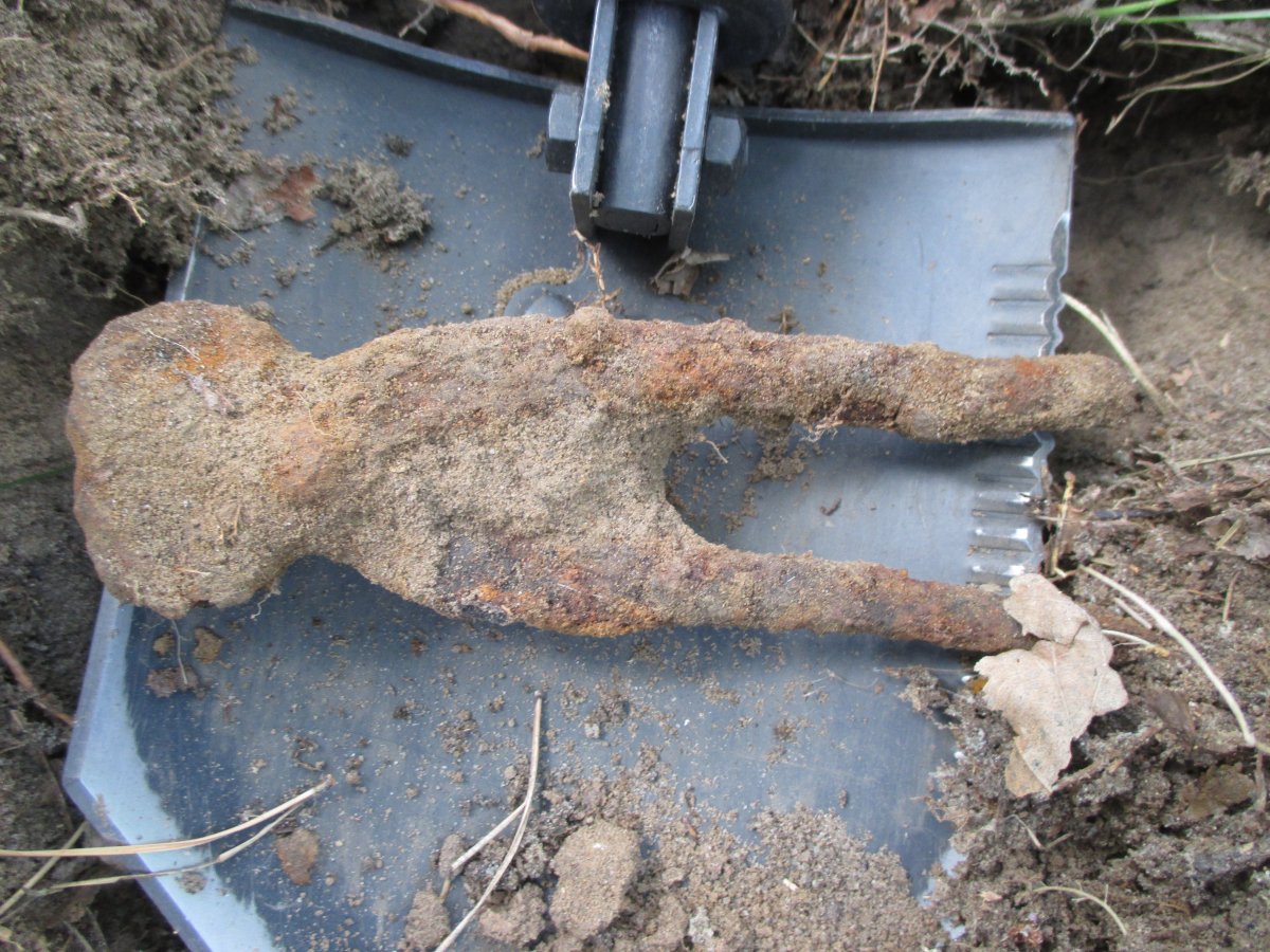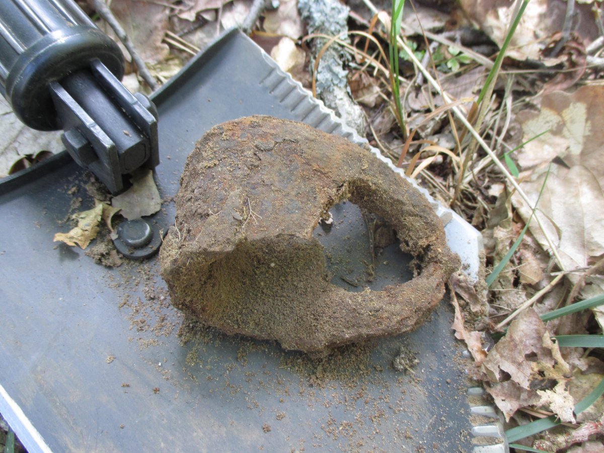 Доброго вечера всем! Ходил сегодня опять в Пущу. У меня, как всегда без приключений не бывает. Был подло укушен со спины , в руку шершнем. Оказалось ,задумался и не заметил их гнездо. Набросились на меня как те собаки. Убегая от них впилился лбом в дерево. Результат - рука (кисть опухла, что перчатка не налазила), и на лбу фонарь. Дедушка, видимо, пытаясь как то компенсировать мне потери ,подарил медаль и горсть советов. И часы) И наткнулся на сброс гвоздей* .(прикопал обратно) Копал их, что бы посмотреть , что под ними. Просто рассказывали случай, что под сбросом нашли полевую сумку, а в ней остатки документов , орден красной звезды и наган. В моём случае - ничего. В общем такой вот выход. Перед уходом попался ещё напёрсток медный. Всем удачных находок под катушку!