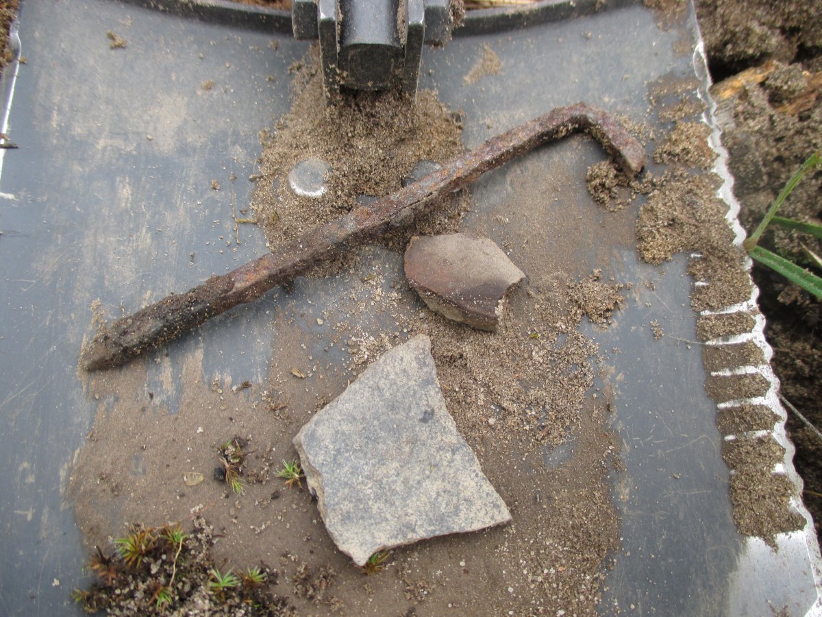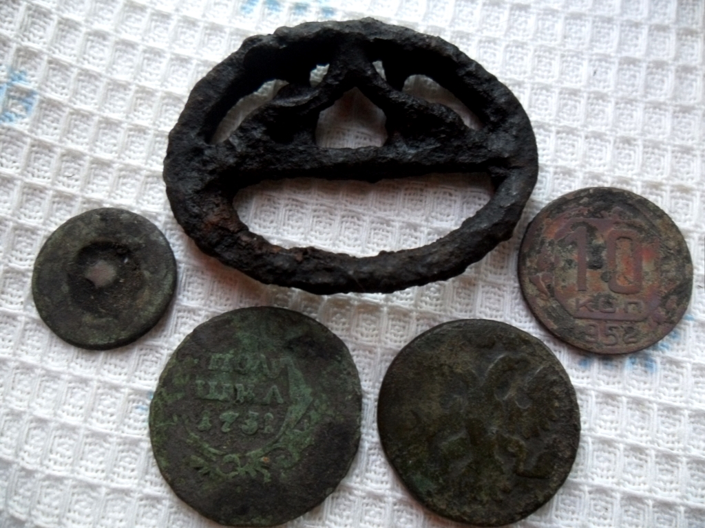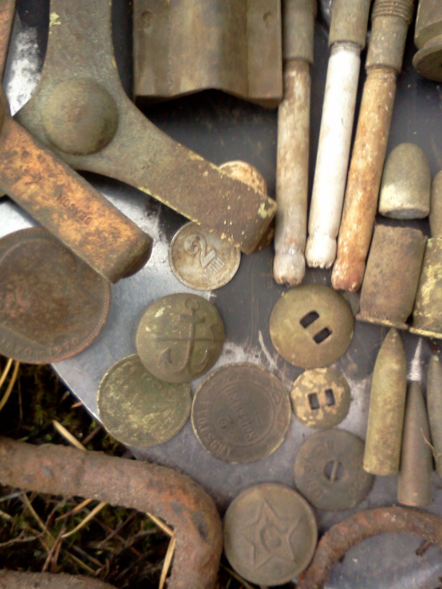 Вчера, Пуща на участке в 3 сотки с обилием садового железа и железобетонных изделий....газон самое сладкое не дали))) только засеяно, опоздал на день)))) рамочный гривенник, копейка, часть ременний пряги и неоаознанная пуля, прошедшая канал, какая-то длинная..