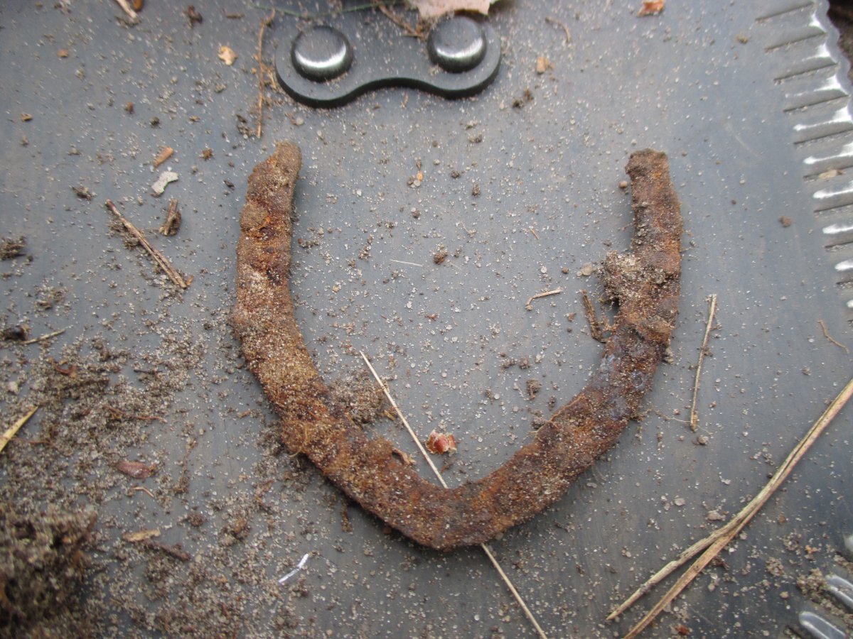 Ездил на поле около Бузовой по КР. Среди ямок накопал разного железа. Справа, так понимаю, современные железки селькохозяйственного назначения, рядом осколок котелка или кувшина (?). Гвозди - их много, обломки ножиков слева вверху. А вокруг ножиков - полукруглые железки непонятного назначения, для подков маленькие...