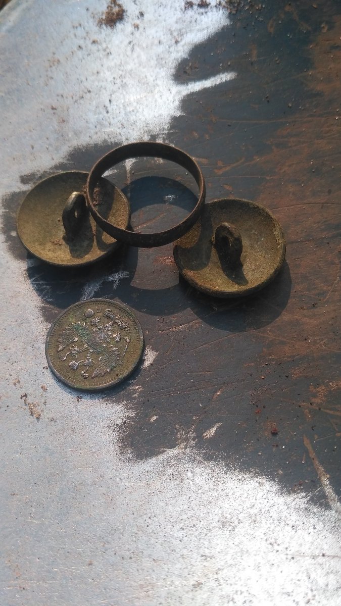 С местами туго. Решили выйти на старую дорогу по координатам Вани Лопаты. Там видать мало хожено и поэтому сразу вылез кошелек. Монеты и прочая латунная жбонь, завесы, крючки, петли, ручки всякие, мало интересовали. Хотелось колечко... Весна в разгаре. Красота неописуемая! За поворотом дороги привлек внимание слабый сигнал. Потом еще и еще. А дальше началось... Не много в краске.. И еще такое. В общем не плохо прошел день. Пуща радует. Каланча еще полна находками.