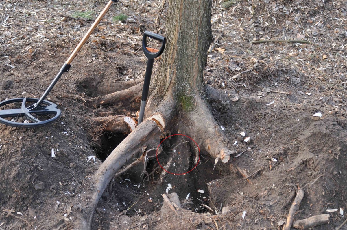 А как Ваш камрад справился с корнями? Я в лесах практически не копаю, может есть какие то простые технологии, как побороть корневища? В моём случае сигнал был где то здесь (обведено красным): Достать цель без удаления дерева было невозможно. В моём случае всё было трохи иначе - МД видел цветную цель, включать режим "пинпоинта" было незачем. Я его вообще НИКОГДА не включаю, за всю свою практику видел всего лишь двух человек, которые юзали пин в Деусе. С этим у меня тоже всё в порядке, уж можете мне поверить на слово