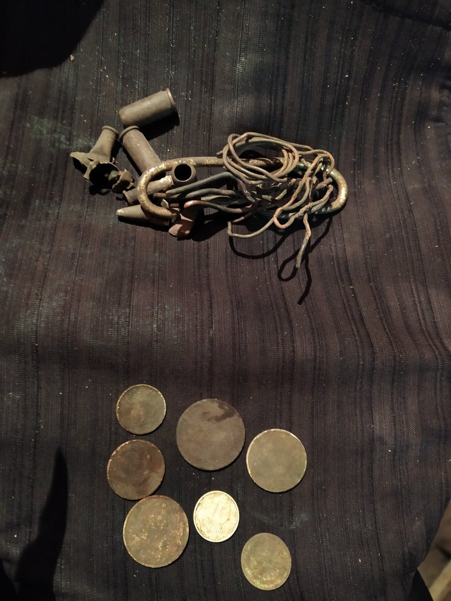 Сегодняшний выход к черту на рога. Пряжку почистил как и монетки. На ладони я так понимаю остатки серьги.