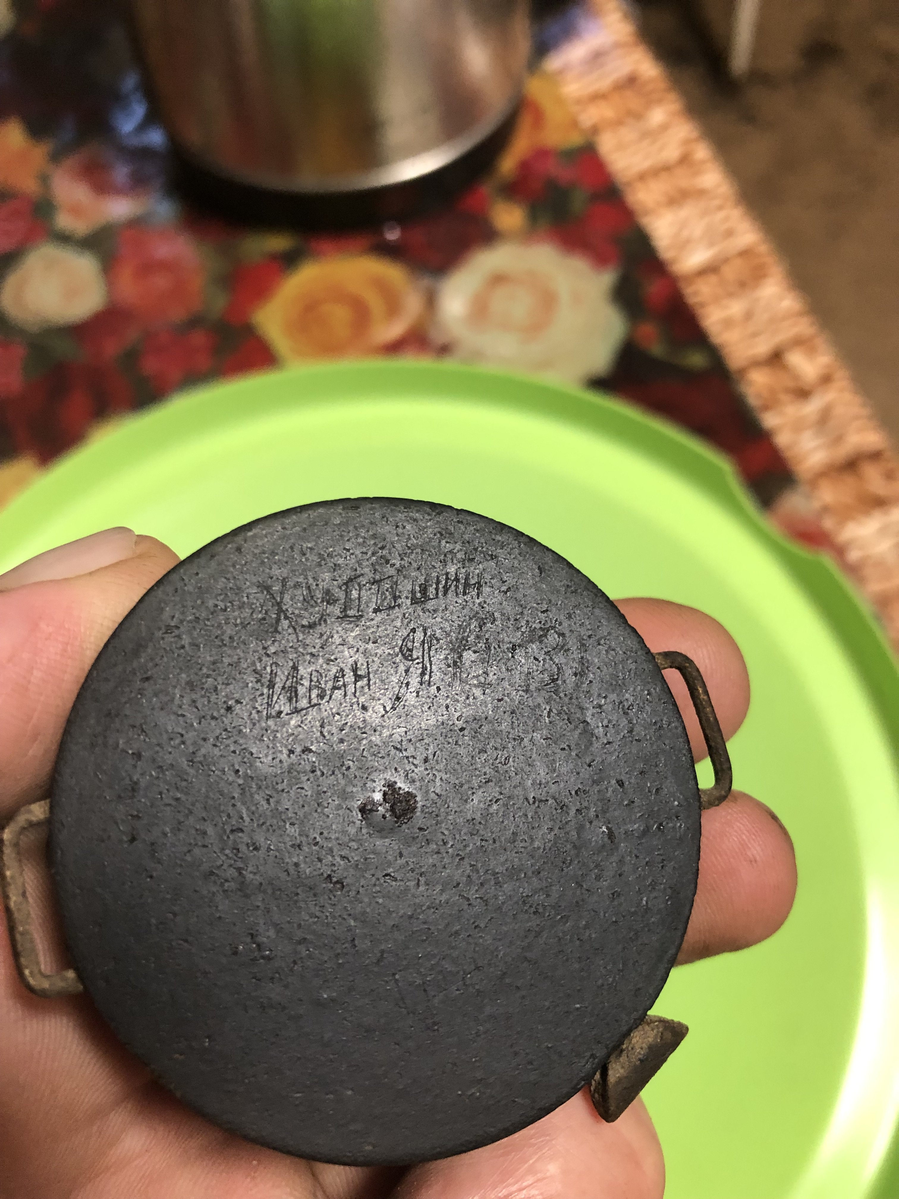 Дело в том, шо случайно надпись обнаружил.. Жинка протерла мокрой тряпкой и на отблеск видно стало. Больше ни чего не видать.. После инициалов вроде пару букв или еще чего? Не понятно….