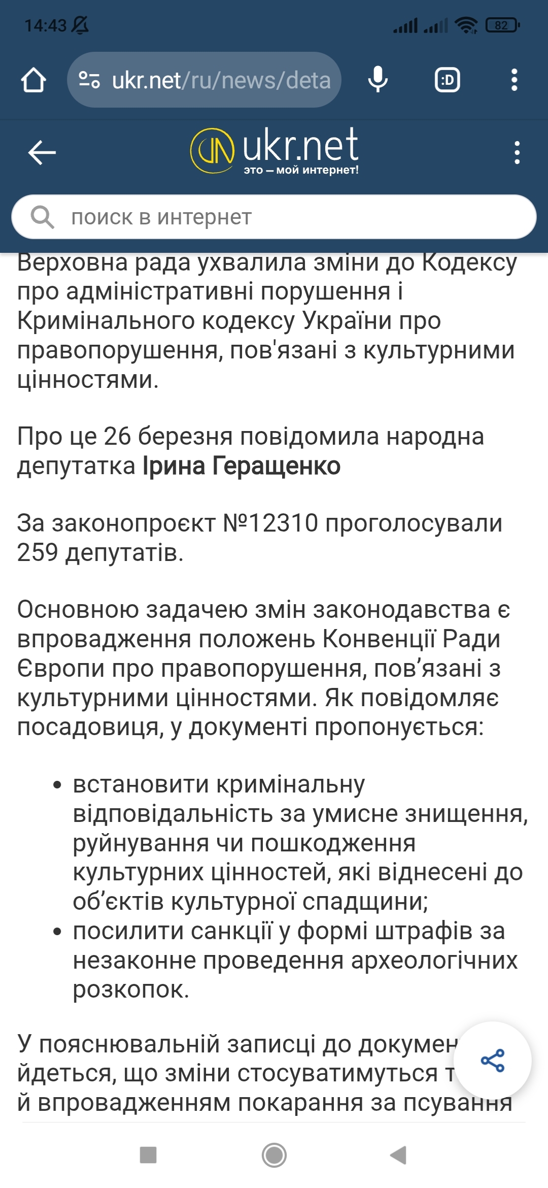 Верховна Рада ухвалила за основу президентський законопроєкт №12310, який вносить зміни до Кодексу України про адміністративні правопорушення та Кримінального кодексу, в зв’язку з ратифікацією Конвенції Ради Європи про правопорушення, пов’язані з культурними цінностями, – Нікосійської конвенції. Про це повідомила народна депутатка від «Слуги Народу», заступниця голови Комітету ВР з питань гуманітарної та інформаційної політики Євгенія Кравчук. Як зазначила парламентарка, мета законопроєкту – вдосконалення правової бази для захисту українських культурних цінностей. «Зокрема, запроваджуються нові визначення злочинів, пов’язаних із культурними цінностями, та визначається відповідальність за їх порушення. Це важливо не лише для збереження історії, а й для боротьби з російськими злочинцями-археологами, які викрадають українські артефакти», – акцентувала Кравчук. Народна депутатка пояснила: законопроєкт передбачає жорсткіші санкції за незаконний обіг культурних артефактів і злочини проти культурної спадщини, що може стати ефективним засобом стримування зловмисників. Крім того, ратифікація Конвенції зміцнює позиції України на міжнародній арені, підвищуючи можливості співпраці з іншими країнами для захисту культурних надбань. «Також передбачено вдосконалення механізмів охорони пам’яток, що дозволить швидше реагувати на випадки їхнього пошкодження чи незаконного вилучення», – уточнила Кравчук. За її словами, законопроєкт допоможе краще захищати нашу культурну спадщину. «Ми повинні дотримуватися законів і свідомо ставитися до культурних цінностей! Водночас країна-агресор не вміє це робити, тому нам необхідно продовжувати боротьбу!», – резюмувала Євгенія Кравчук.