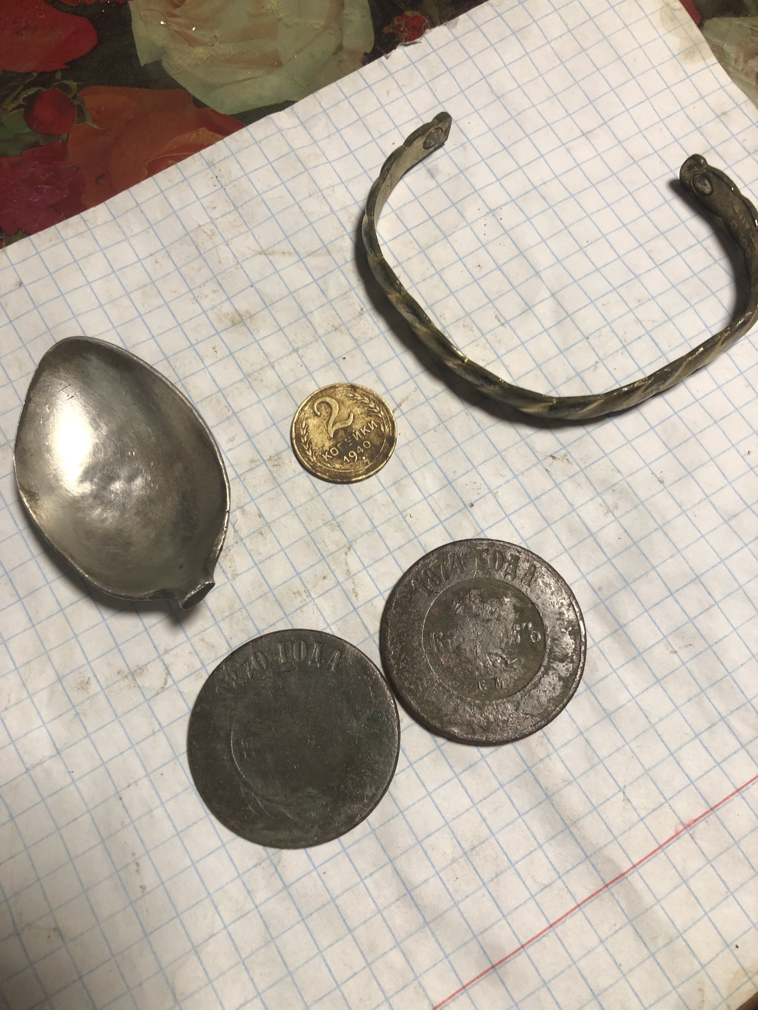 Выходов много, пару 5таков попалось такого чекана в первые, один правда затертый в 0. Режик рабочий вчера в сумерках Остатки ложки глубоко, вди било 95 очень четко.. видно что ели ею очень долго.. Серебро или нет? Не знаю как проверить. Общем усе на фото Браслет попался- думал в начале поясок, но латунный… Дома рассмотрел и почистил, надписи на скифском не читаю