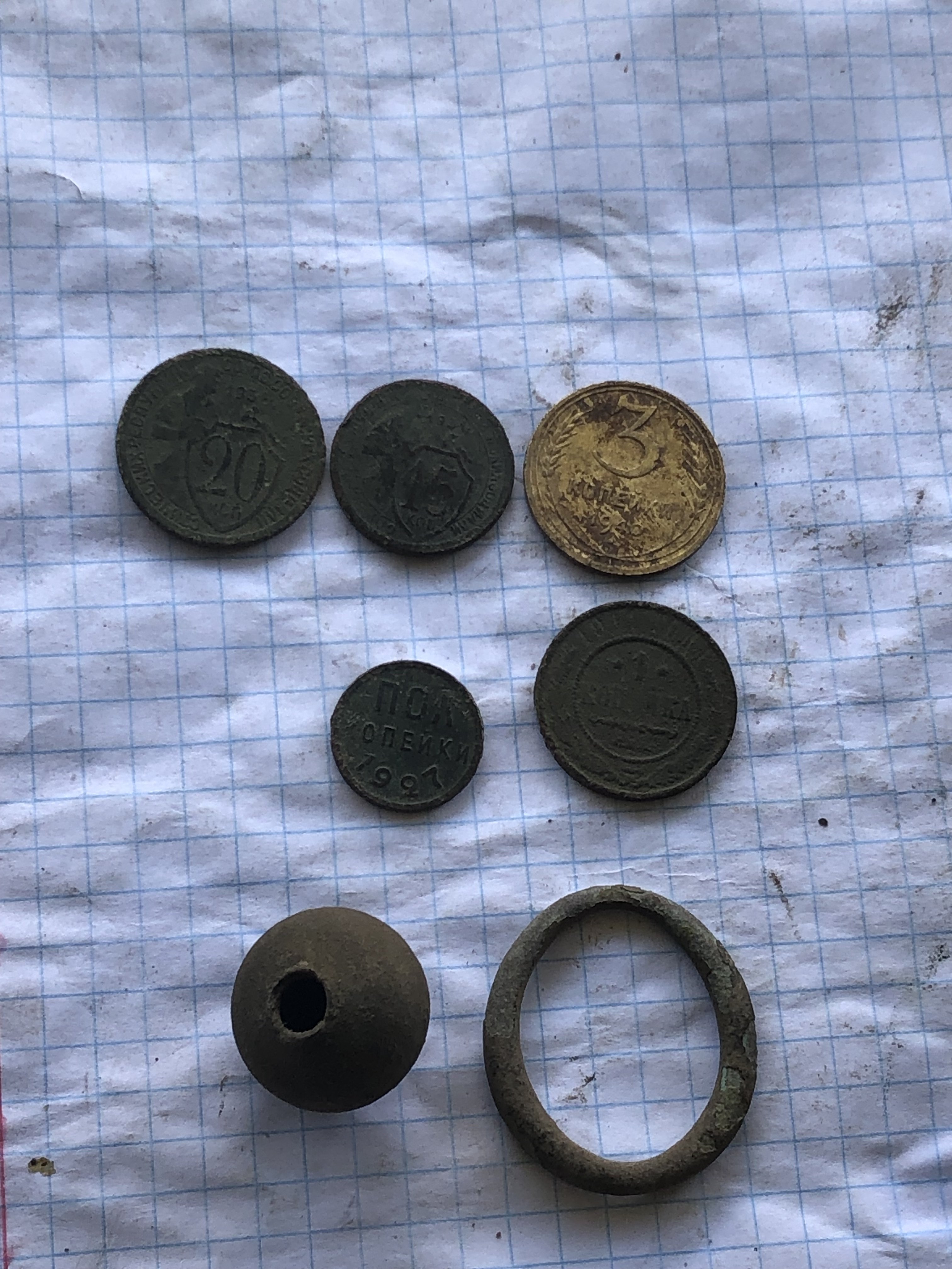 Все шо забрал Пол копейки порадовала, второй раз попадается. сигнал такой звонкий 89 дзынь . С низу не знаю что. Кругляшка медь, вторая деталька латунь или сплав ( так ВДИ показало) Камары напрягают уже… Золота пока шо нет