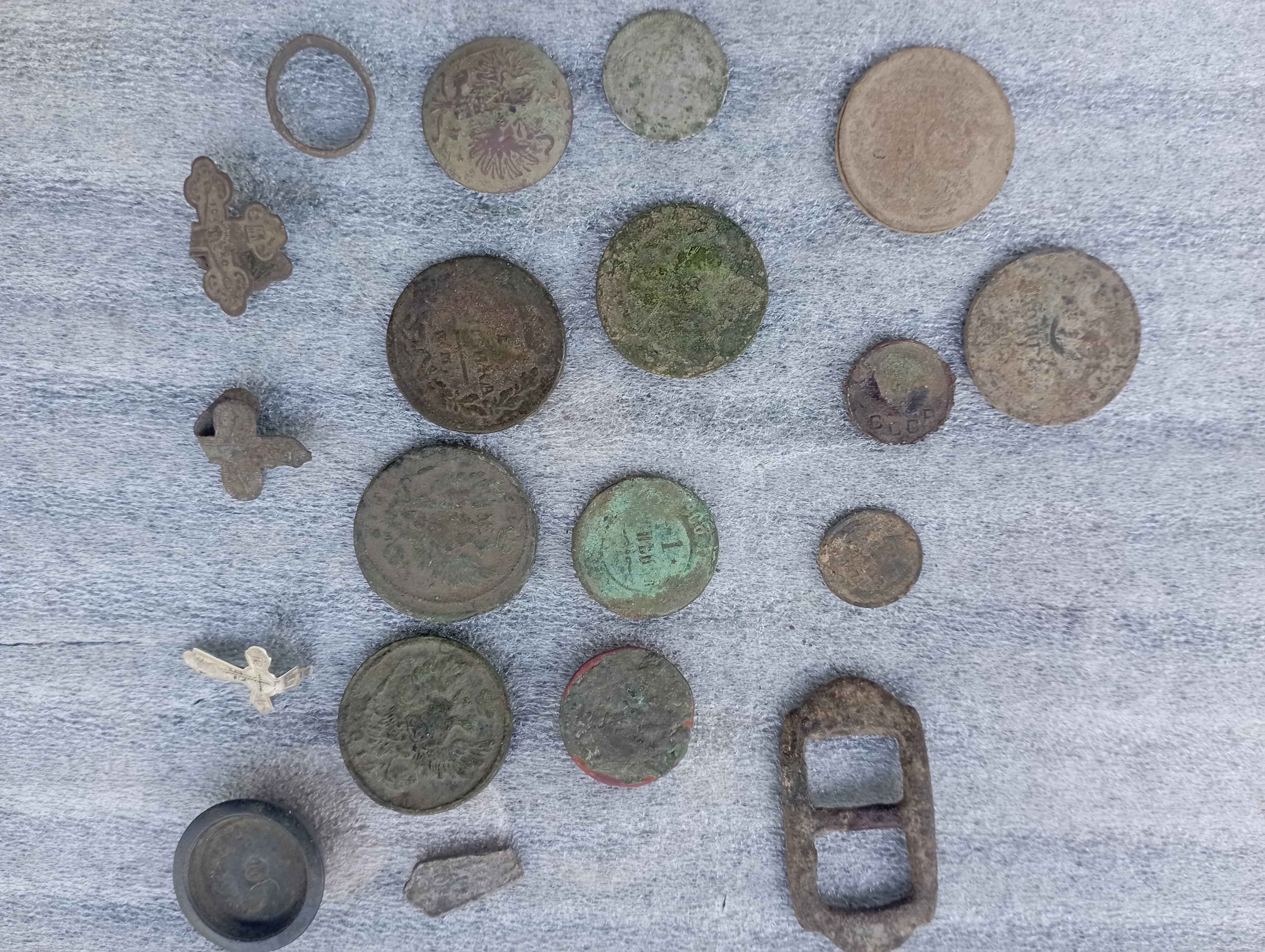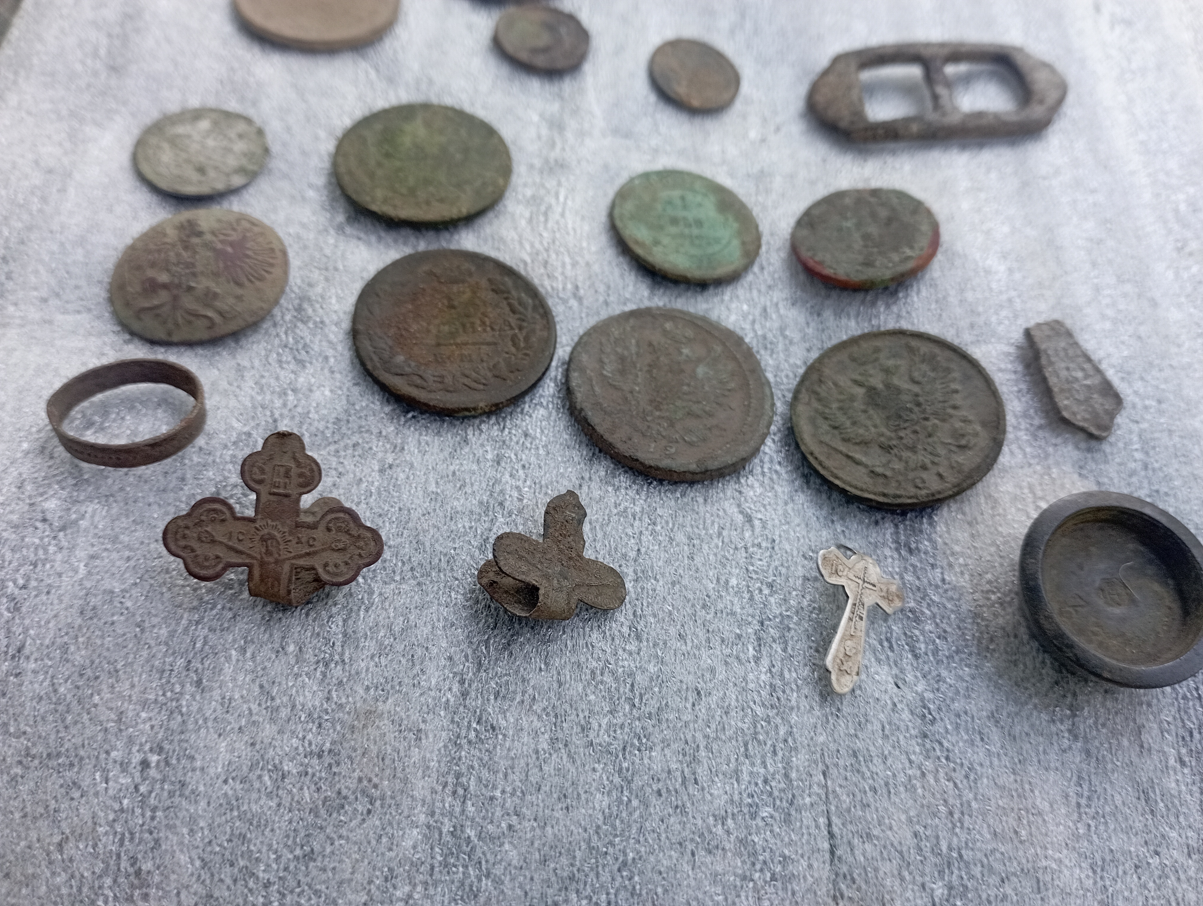 Вроде и находок немало, а показать нечего. Крестик серебро в эмалях - загнутый, гривенник царский - лысый.. разве что гирька бронзовая прикольная попалась да копейка- капуста вроде не сильно частая.