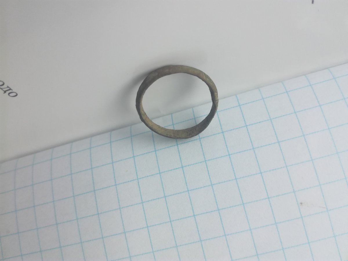 Матеріал мідь чи бронза, форма груба, неправильна, явно старе. Розмір малий, як дитяче (якщо воно для пальців). Один край наче трохи вужчий, аніж інший.