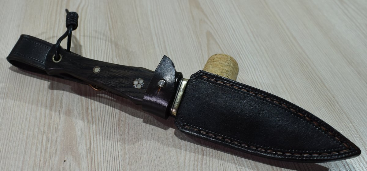 Матеріали руків'я: стабілізований морений дуб, мельхіор, фібра, коріан, мозаїчний пін з люмінофором, темлячний пін.