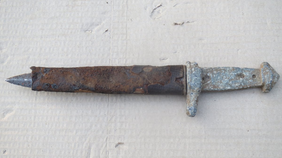 Здравствуйте уважаемые камрады! Товарищ нашёл нож похожий на штык-нож и просит помощи с определением. Ножны товарищ угробил вынимая нож. Ножны были с шариком на конце и покрыты кожей. Ручка, по видимому отлита кем то самостоятельно из метала похожего на свинец. Спасибо! С уважением.