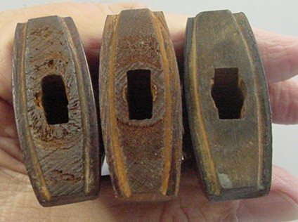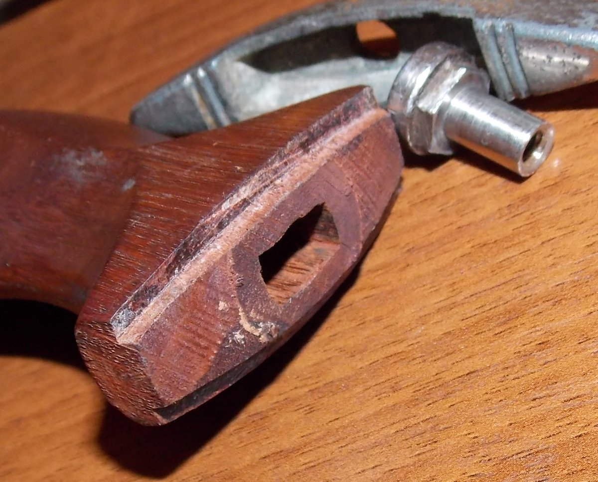 Вот образцы торцов рукоятей, где показаны следы обработки на копийных ( две левые) рукоятях и на оригинальной ( крайняя справа) рукояти. У Игорюшкина кстати на рукояти это место всё как должно быть, это к слову. Как видим есть серьёзные отличия в чистоте обработки. Прошу обратить внимание как хорошо выполнены на копиях отверстия под хвостовик. Добавлю, крайняя правая, оригинальная, имеет другую форму отверстия, но это более характерно для среднего и позднего периода производства и зависит от производителя. Фото с GD.