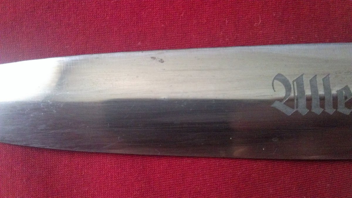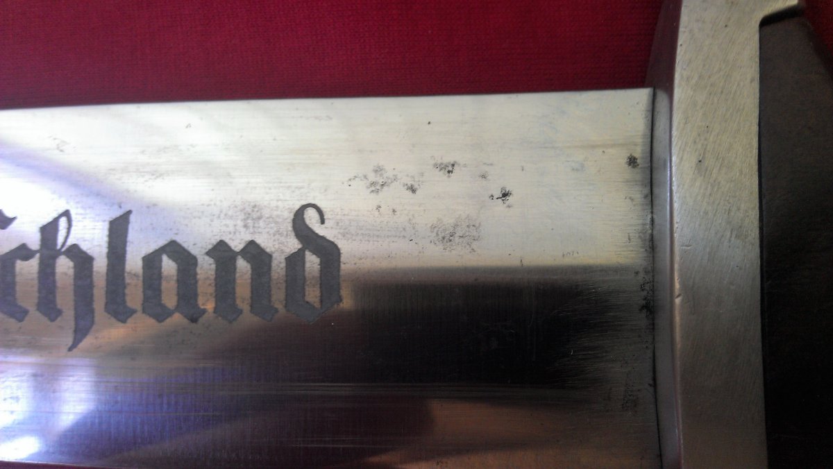 Протрите ветошю,предварительно нанеся WD40 даный спрей можна приобрести в любом авто-магазине,потом нанесите или оружейную смазку,или просто протрите ветошью,с маслом,и больше предмет голыми руками не берите,для этого можна приобрести белые рукавички,они стоят в инете от 14 грн и до 21 грн. И старайтесь предмет хранить не у ножнах.С ув