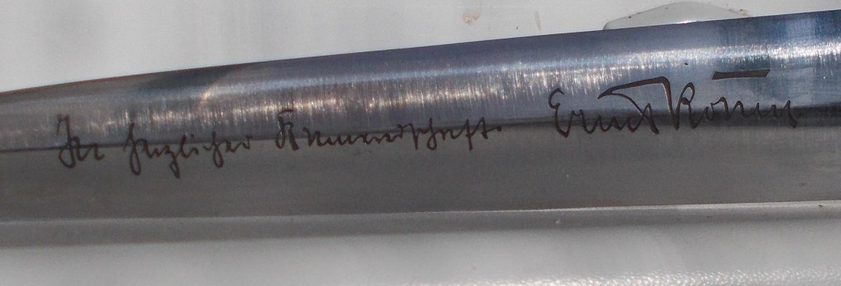 Добрий ранок, вибачте, що влажу у вже вашу дискусію... хотів би нагадати, що питання стояло лише - чи є сенс відновити напис - Innerzlicher Freundschaft Ernst Rohm» — «На знак сердечної дружби Эрнст Рем» ? малося на увазі саме історичний сенс, а не матеріальний (це відносно - "главное бабки"..). Сам клинок на мою думку в ідеальному стані... та і тепер без напису нормально виглядає. Відносно ж ручки, що викладена на фото даного клинка, то викладено денацифікавану ручку, щоб не було до даного ресурсу питань згідно діючого нині Законодавства (відповідно ручка з орлом та таблеткою є).... Дякую за "допомогу".