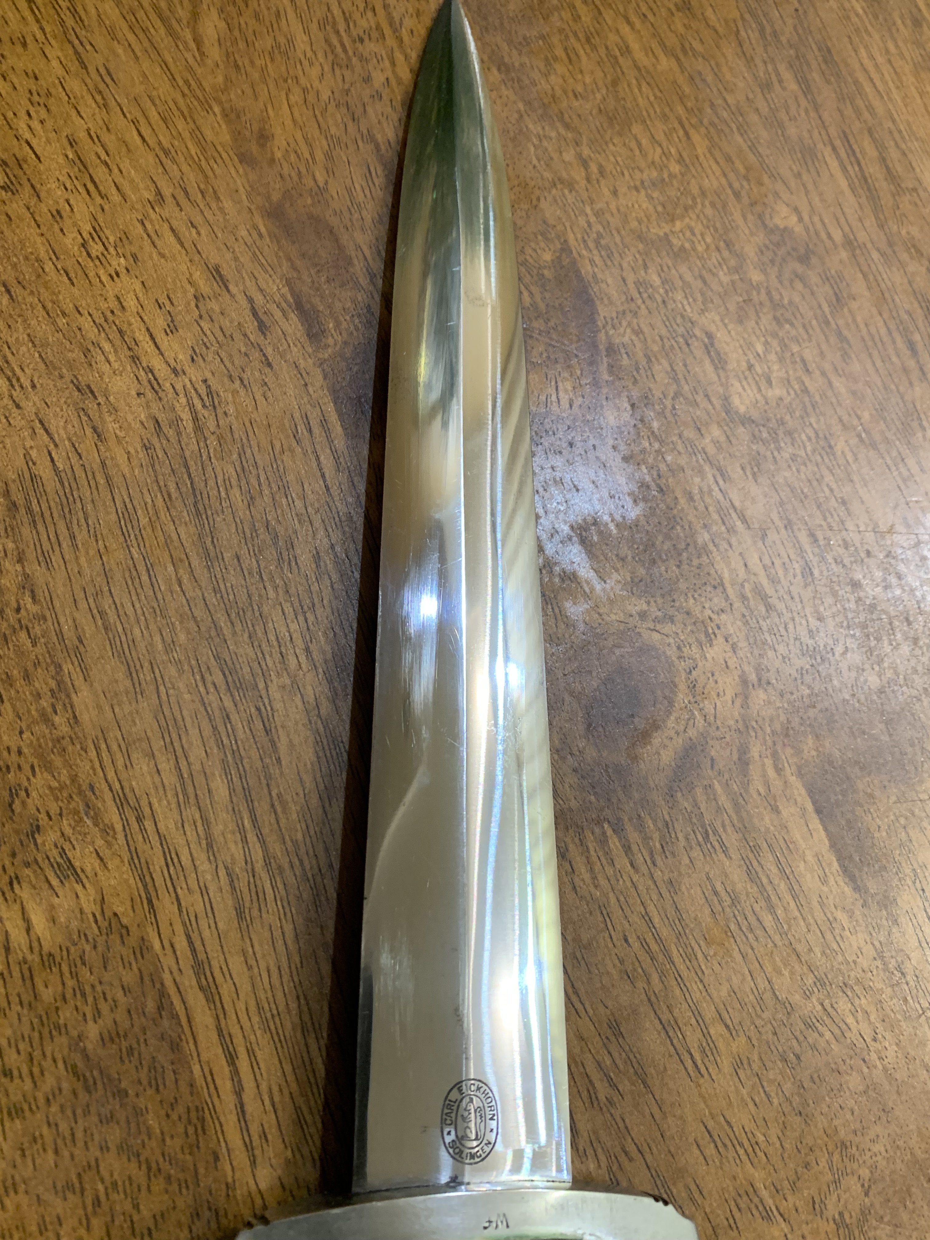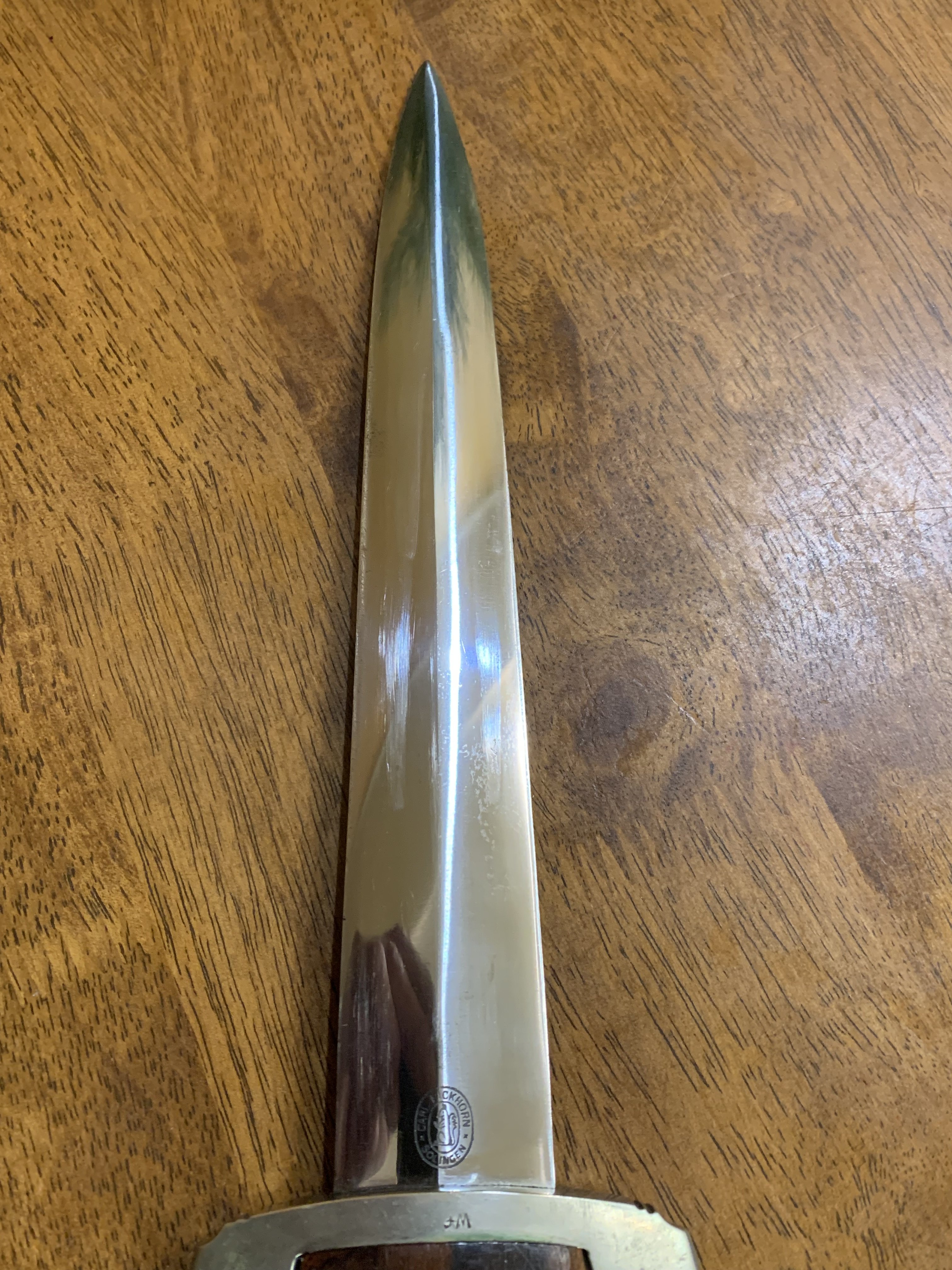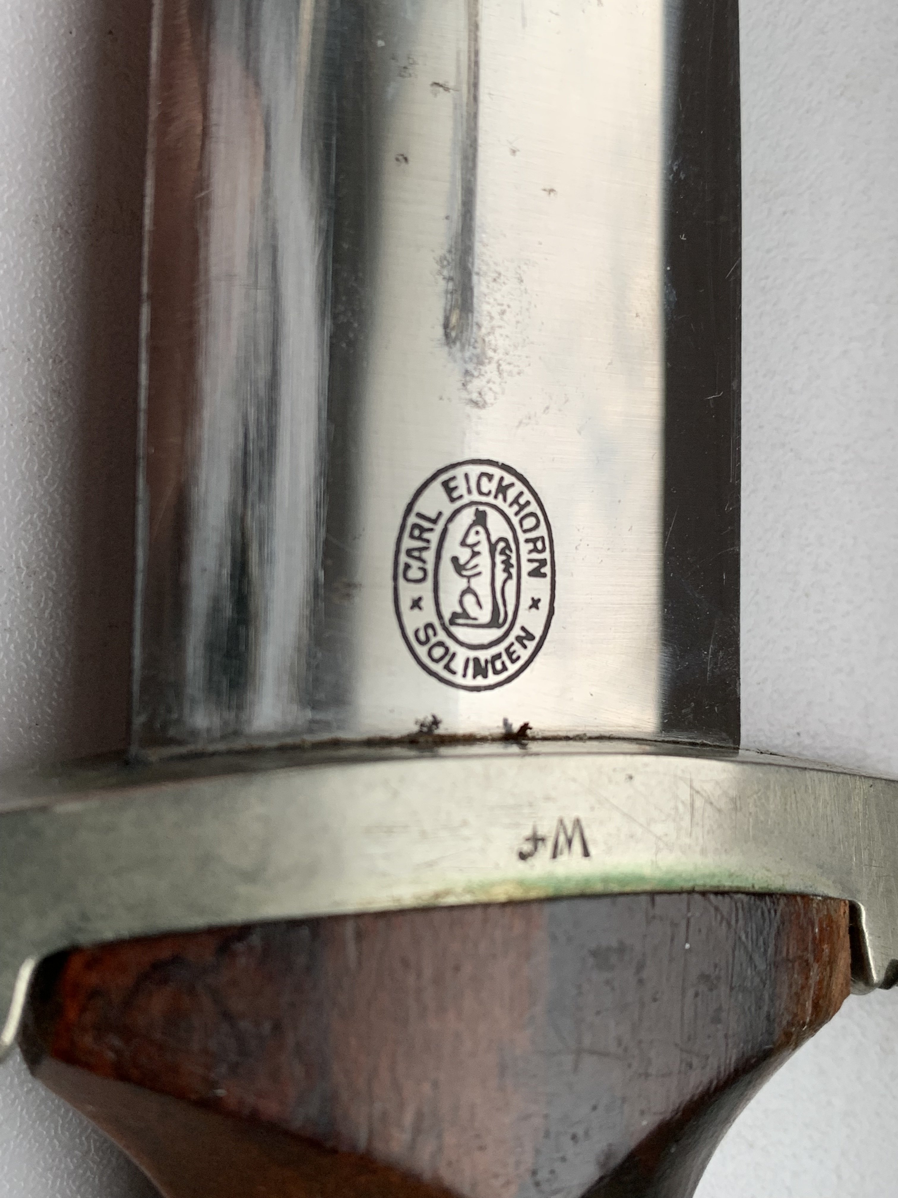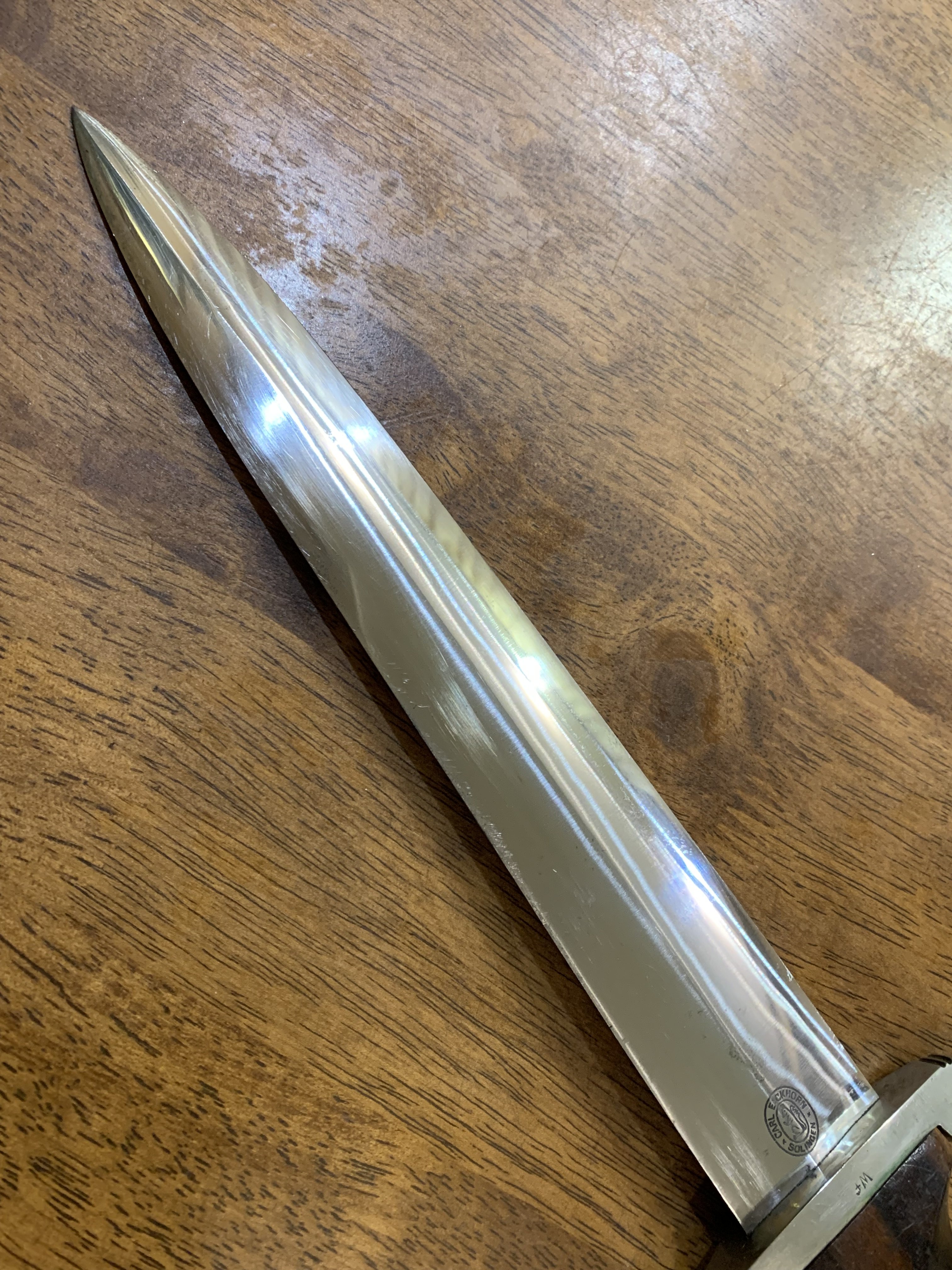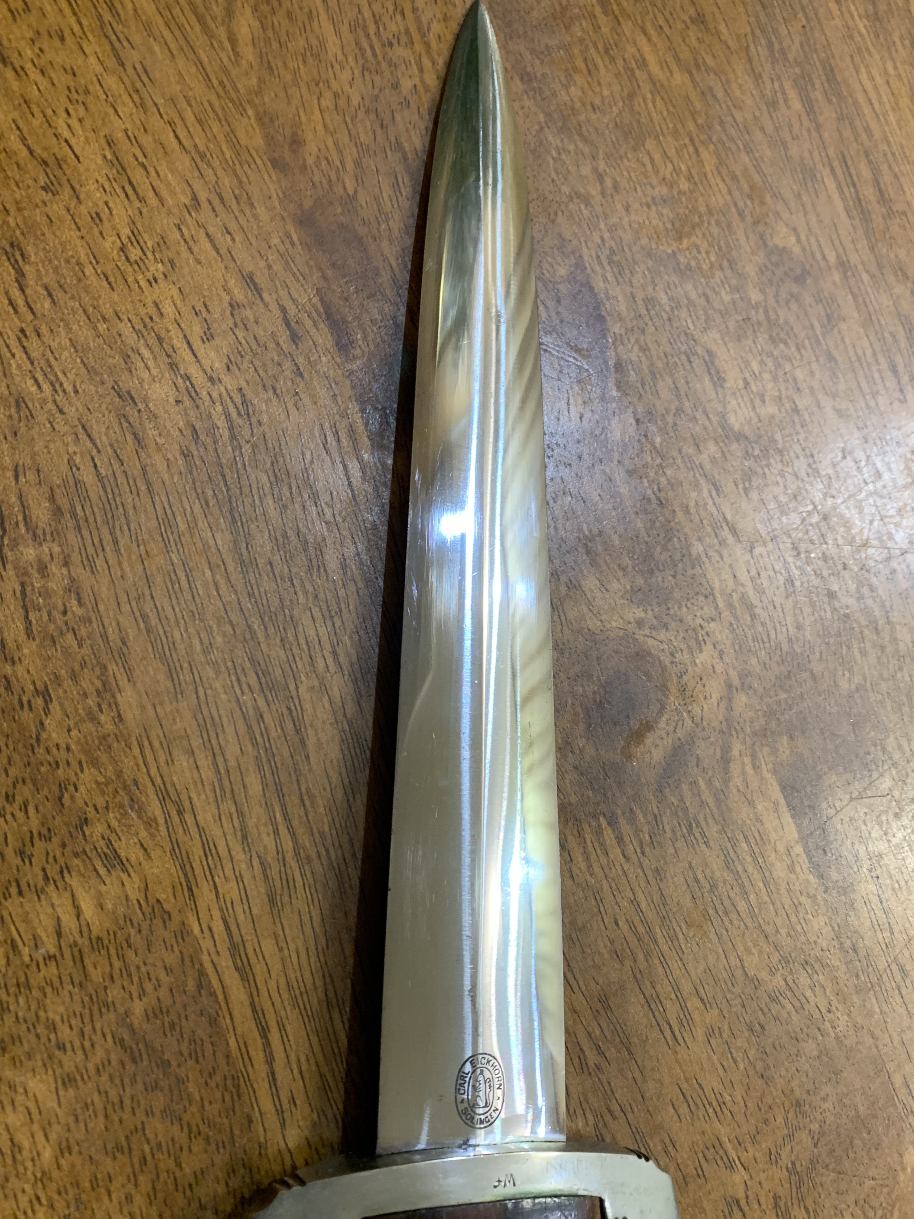 Вітаю. У вас оригінальний кинджал. З приємною патиною, що рідко можна зараз побачити. Знак района ГАУ Wf (Westfalen) відповідає цьому виробнику. Порада Вам: ніколи не потрібно розбирати кинджали. З товщиною леза у Вашого кинджала все нормально. Фото для прикладу, правда другого виробника.