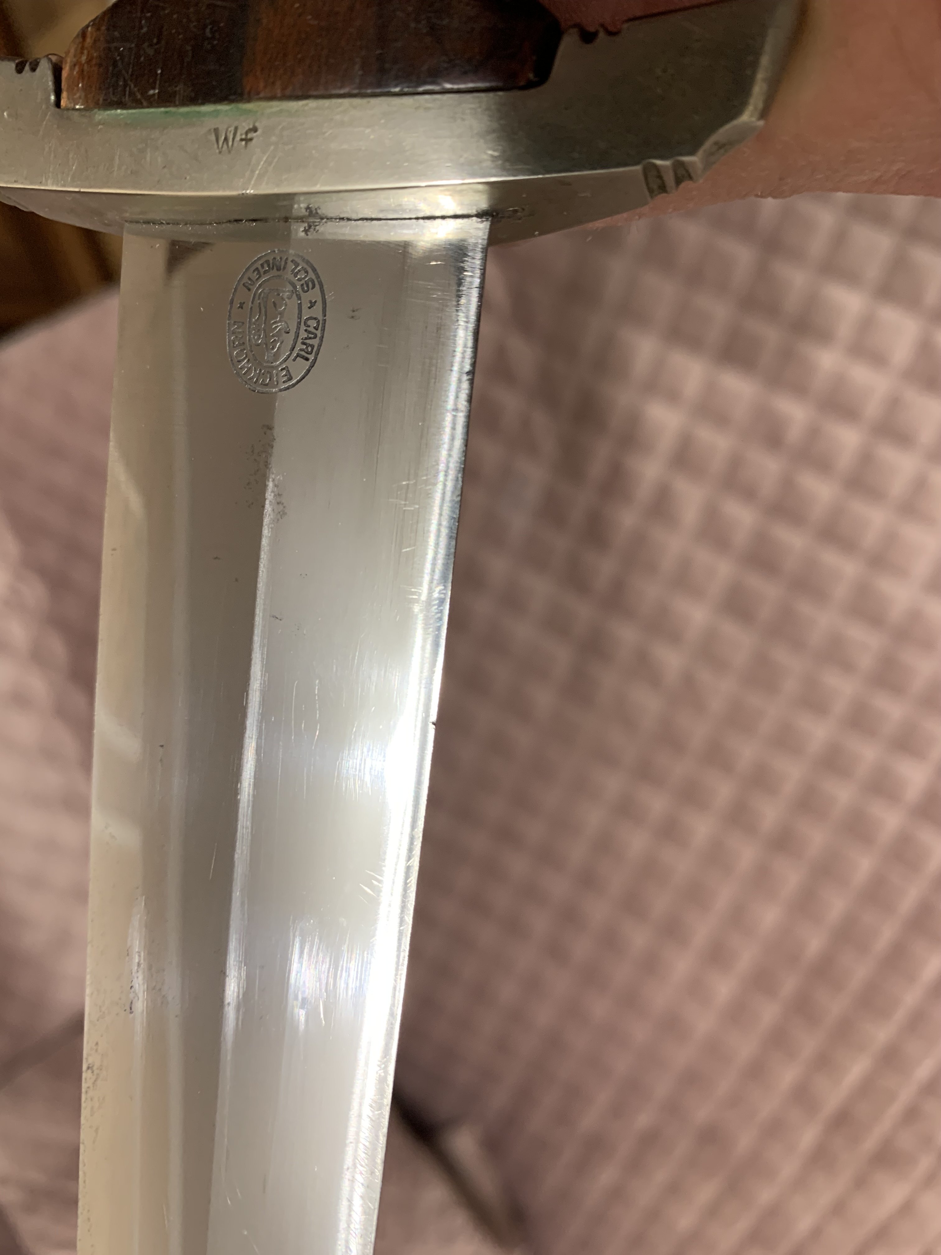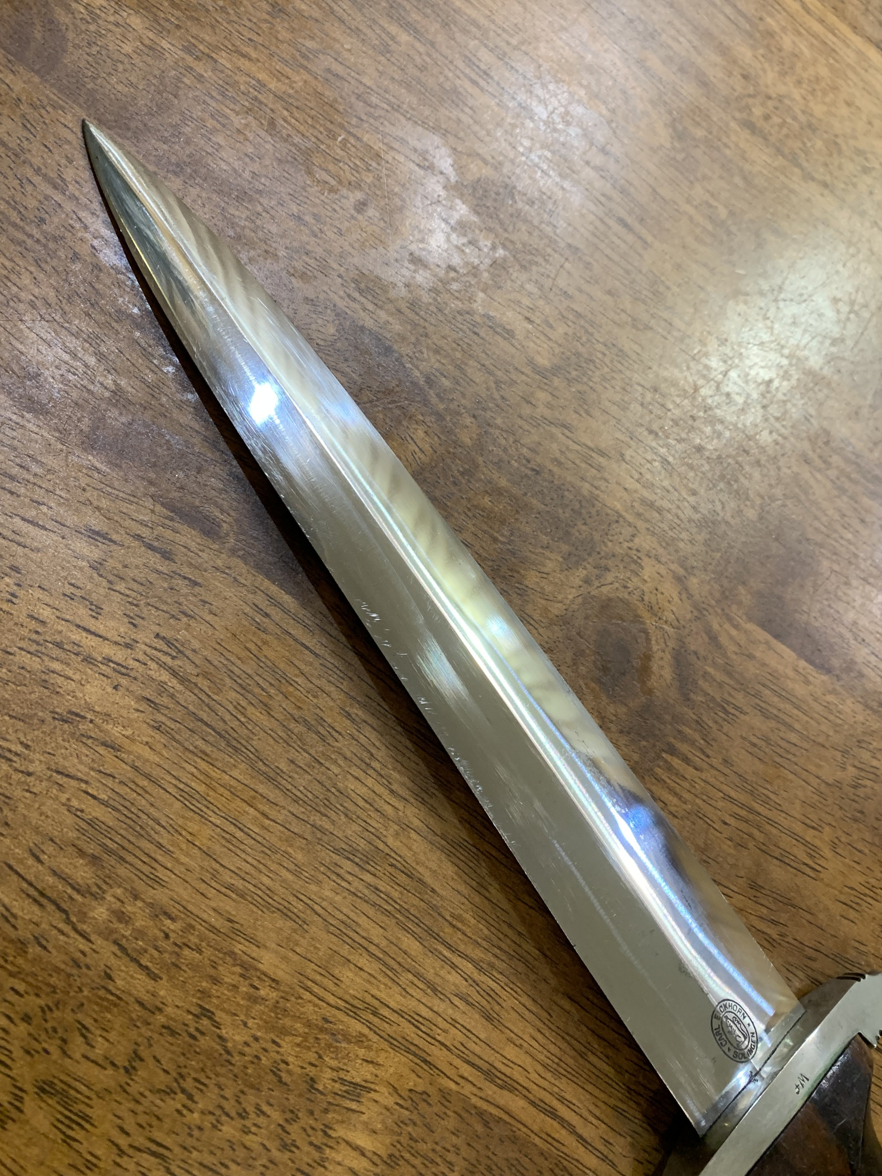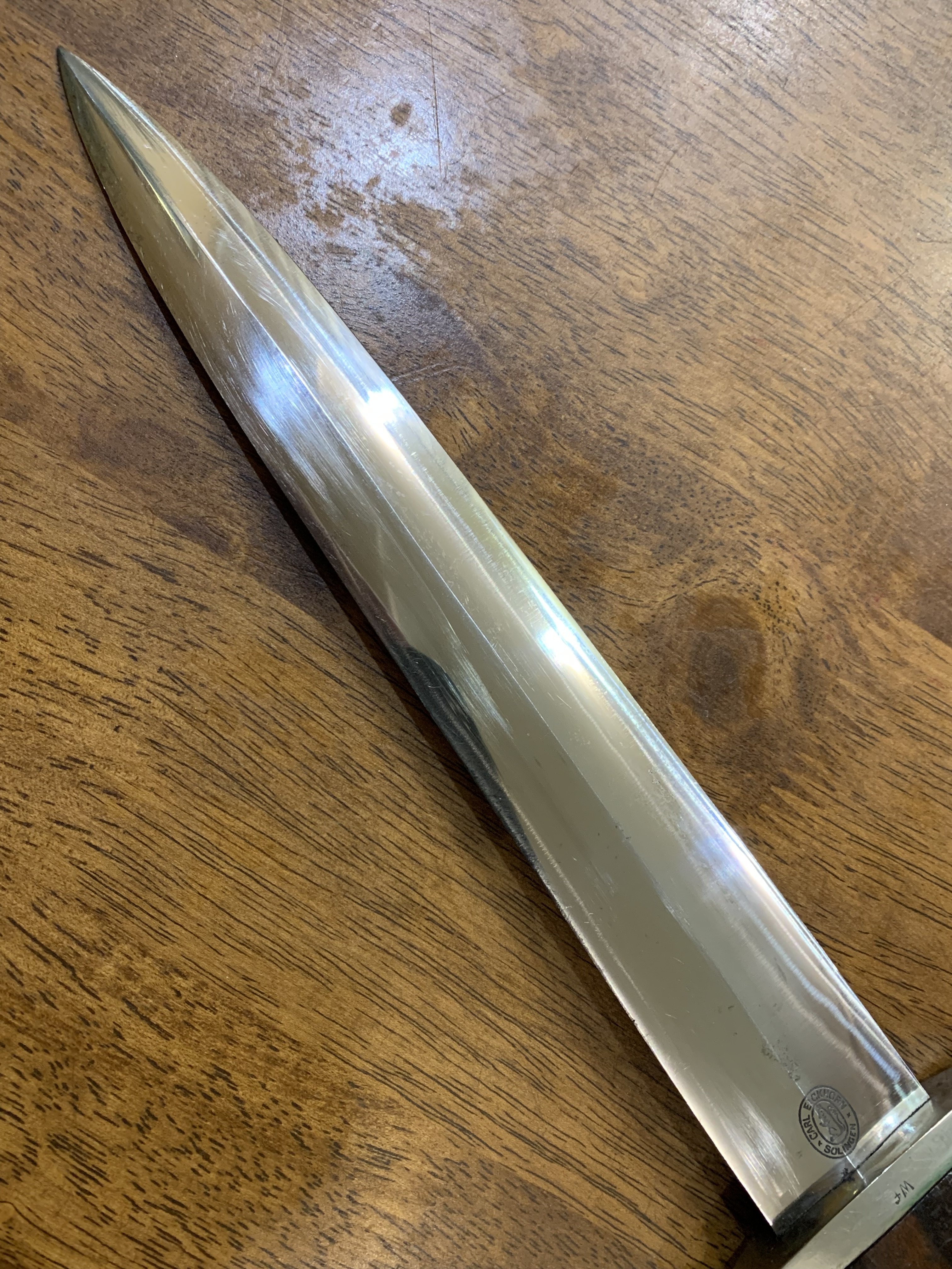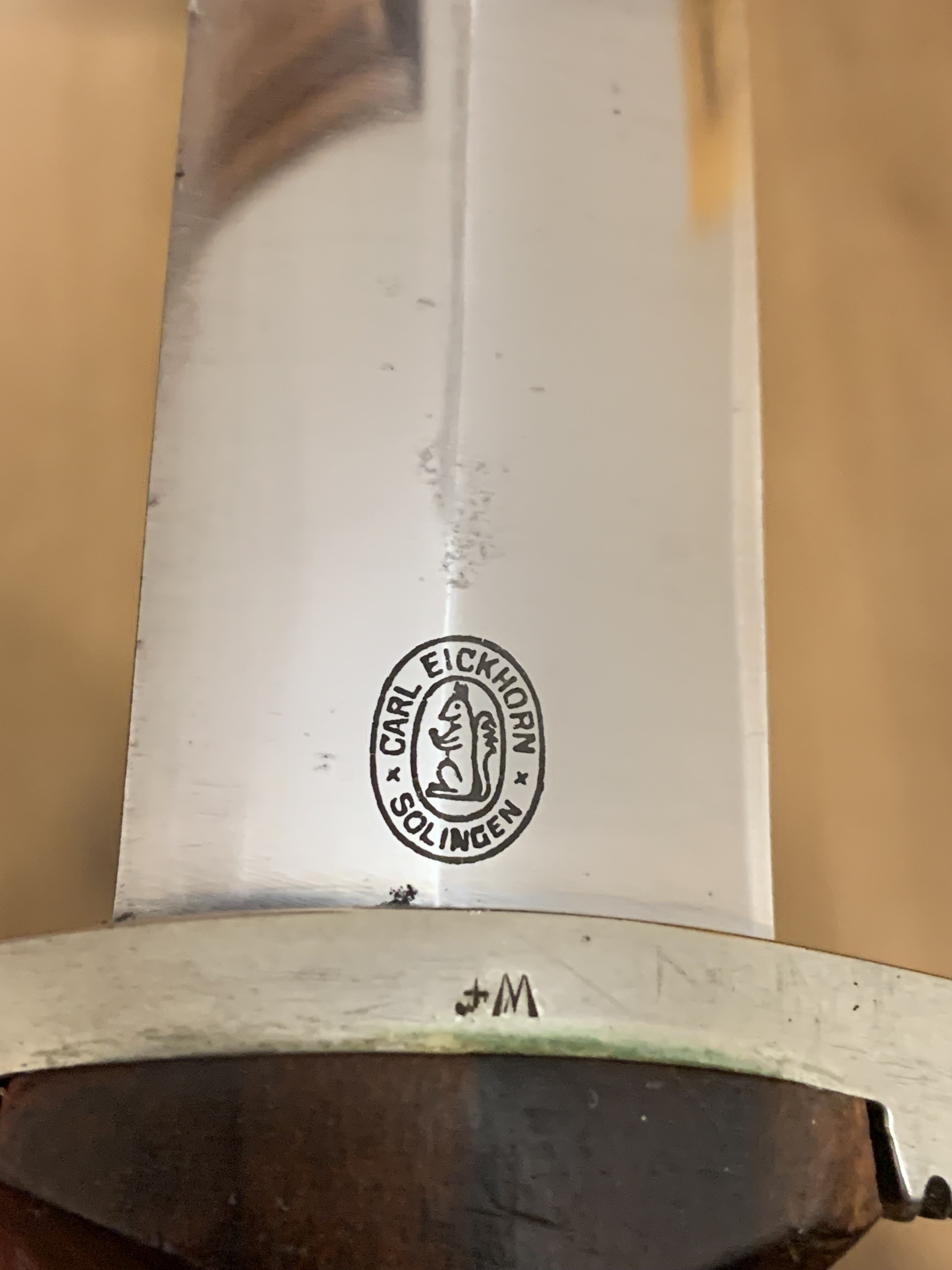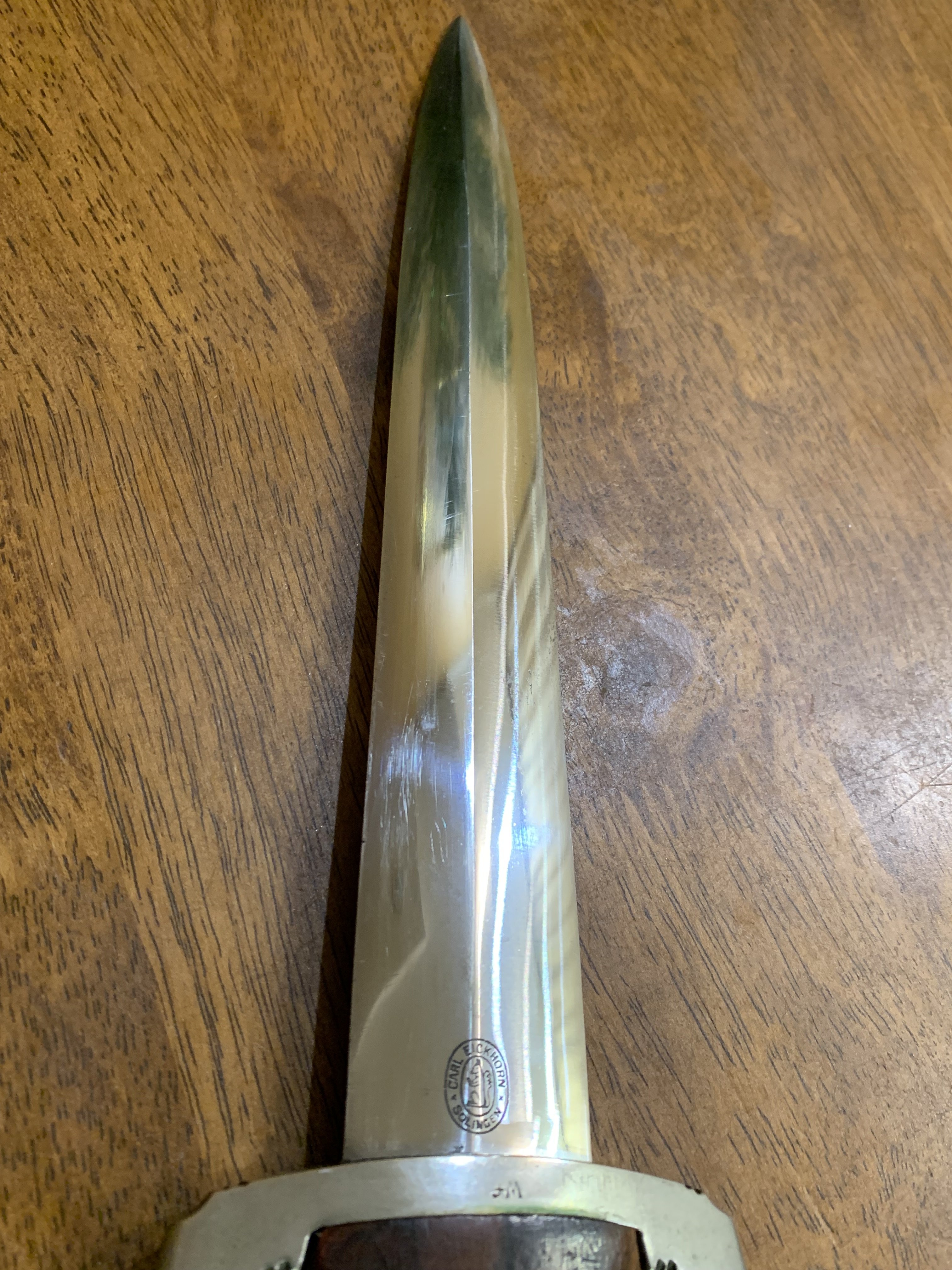 Вітаю. У вас оригінальний кинджал. З приємною патиною, що рідко можна зараз побачити. Знак района ГАУ Wf (Westfalen) відповідає цьому виробнику. Порада Вам: ніколи не потрібно розбирати кинджали. З товщиною леза у Вашого кинджала все нормально. Фото для прикладу, правда другого виробника.