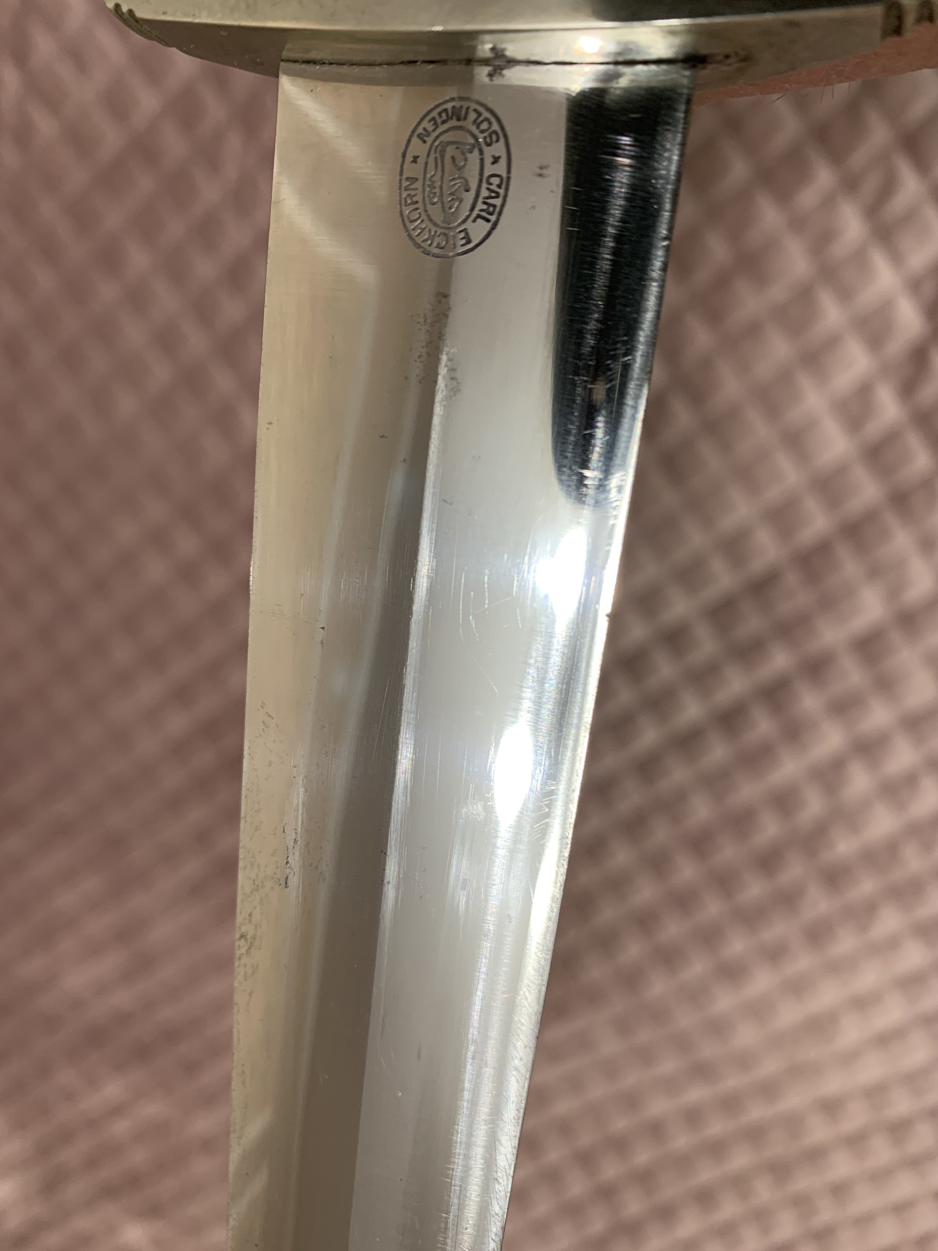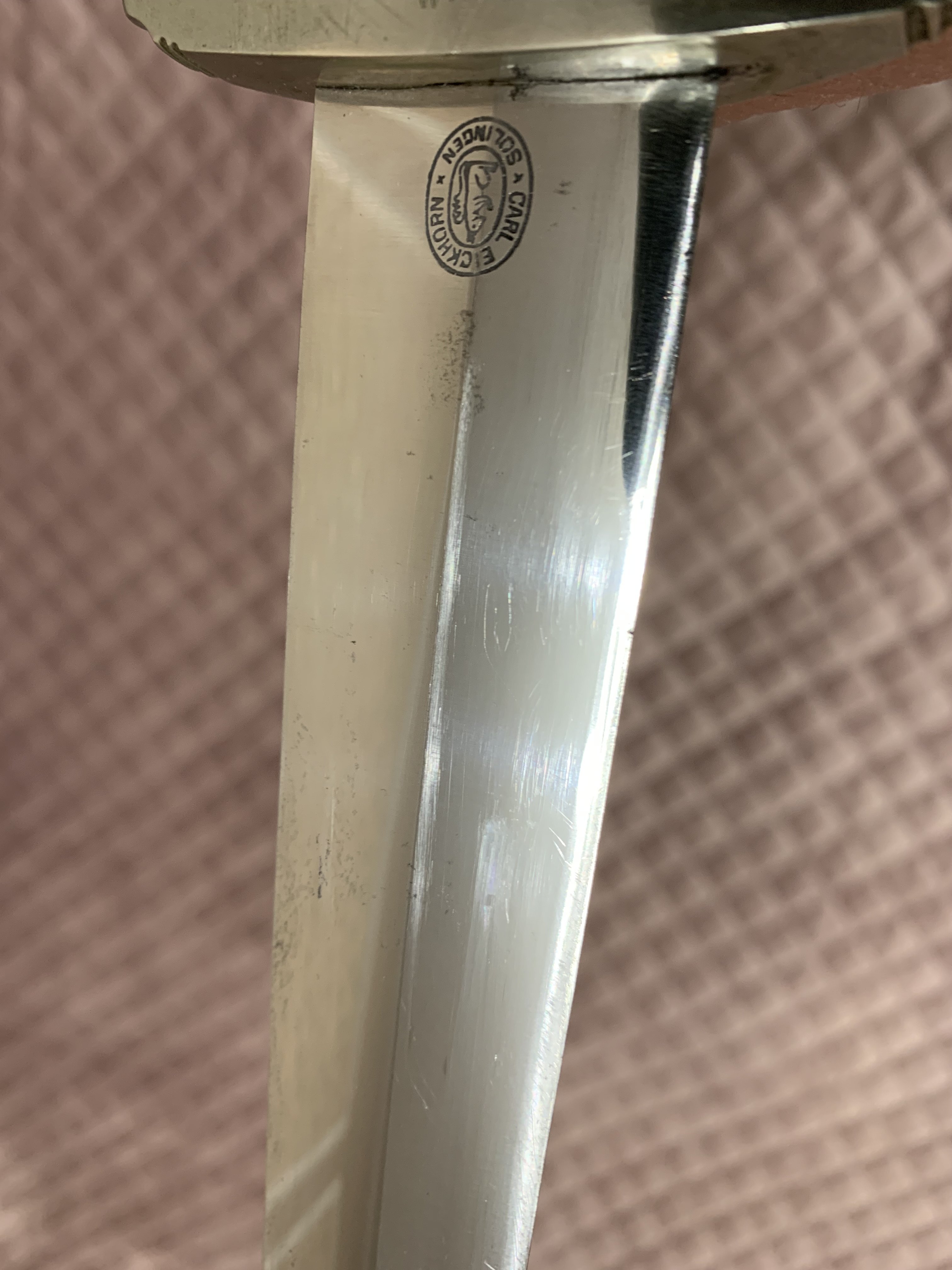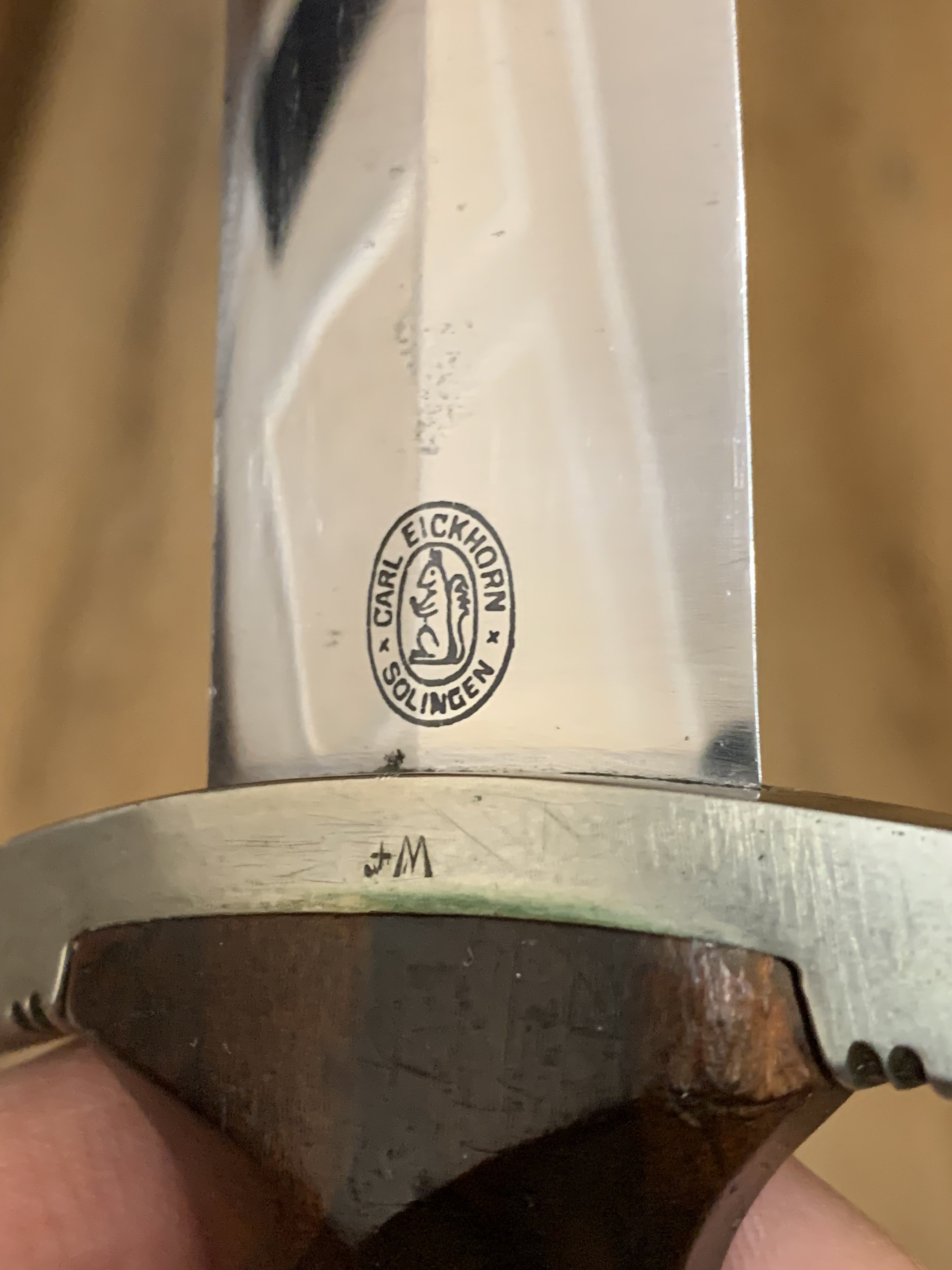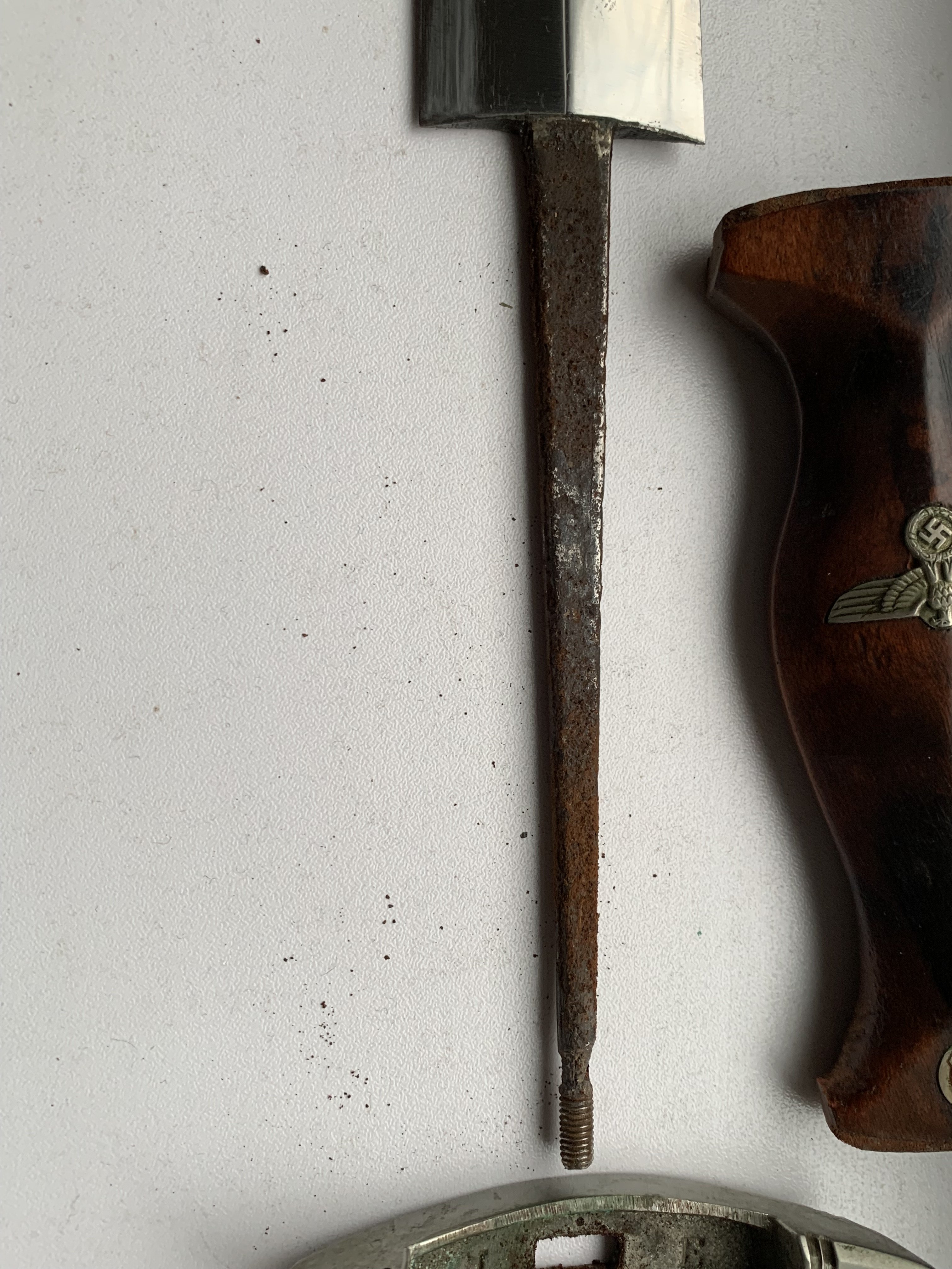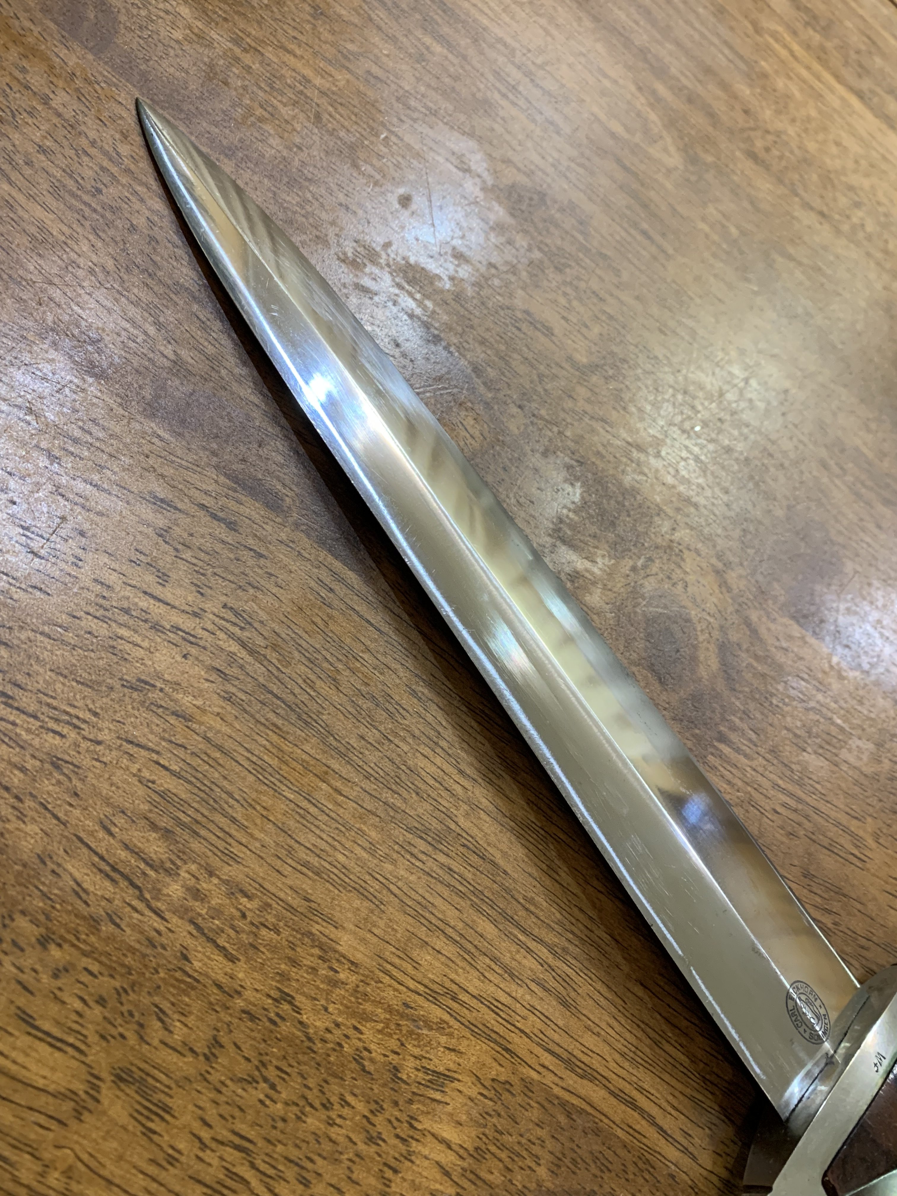 Вітаю. У вас оригінальний кинджал. З приємною патиною, що рідко можна зараз побачити. Знак района ГАУ Wf (Westfalen) відповідає цьому виробнику. Порада Вам: ніколи не потрібно розбирати кинджали. З товщиною леза у Вашого кинджала все нормально. Фото для прикладу, правда другого виробника.