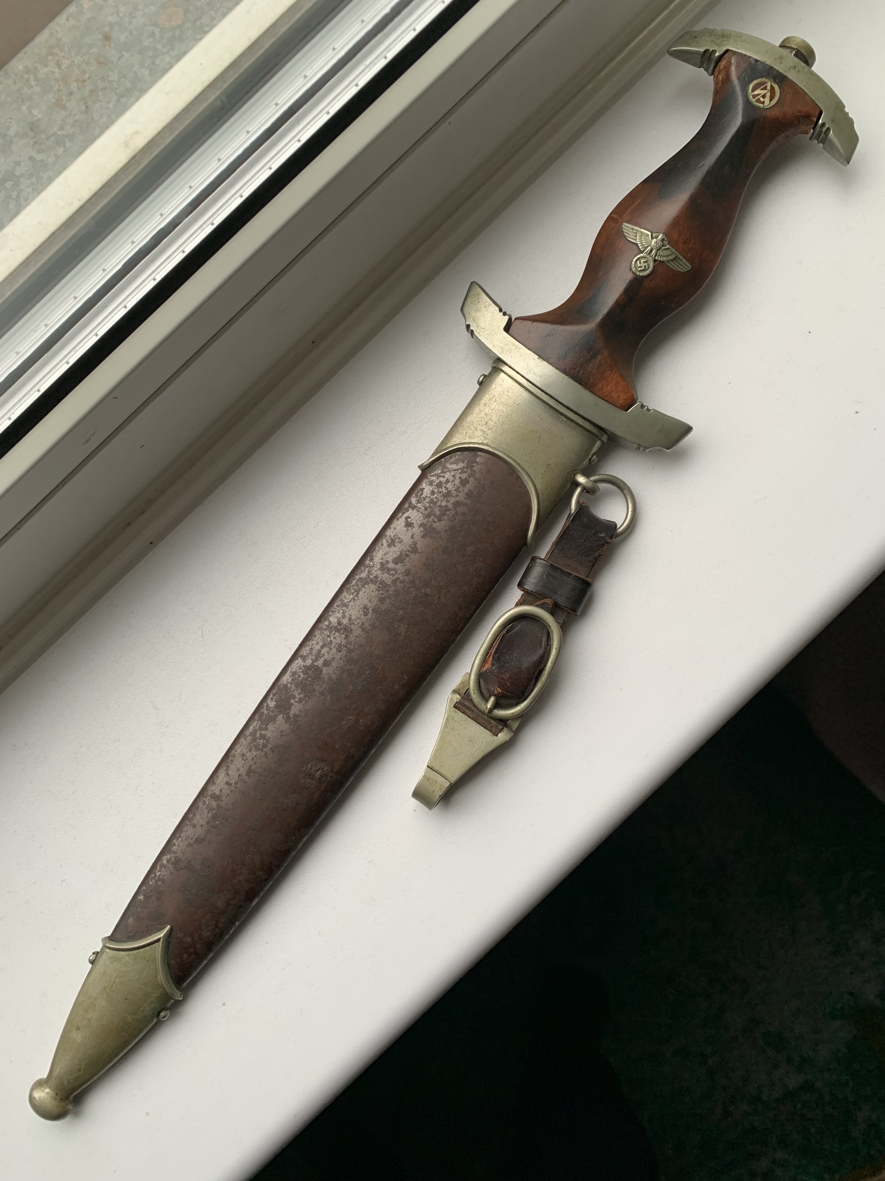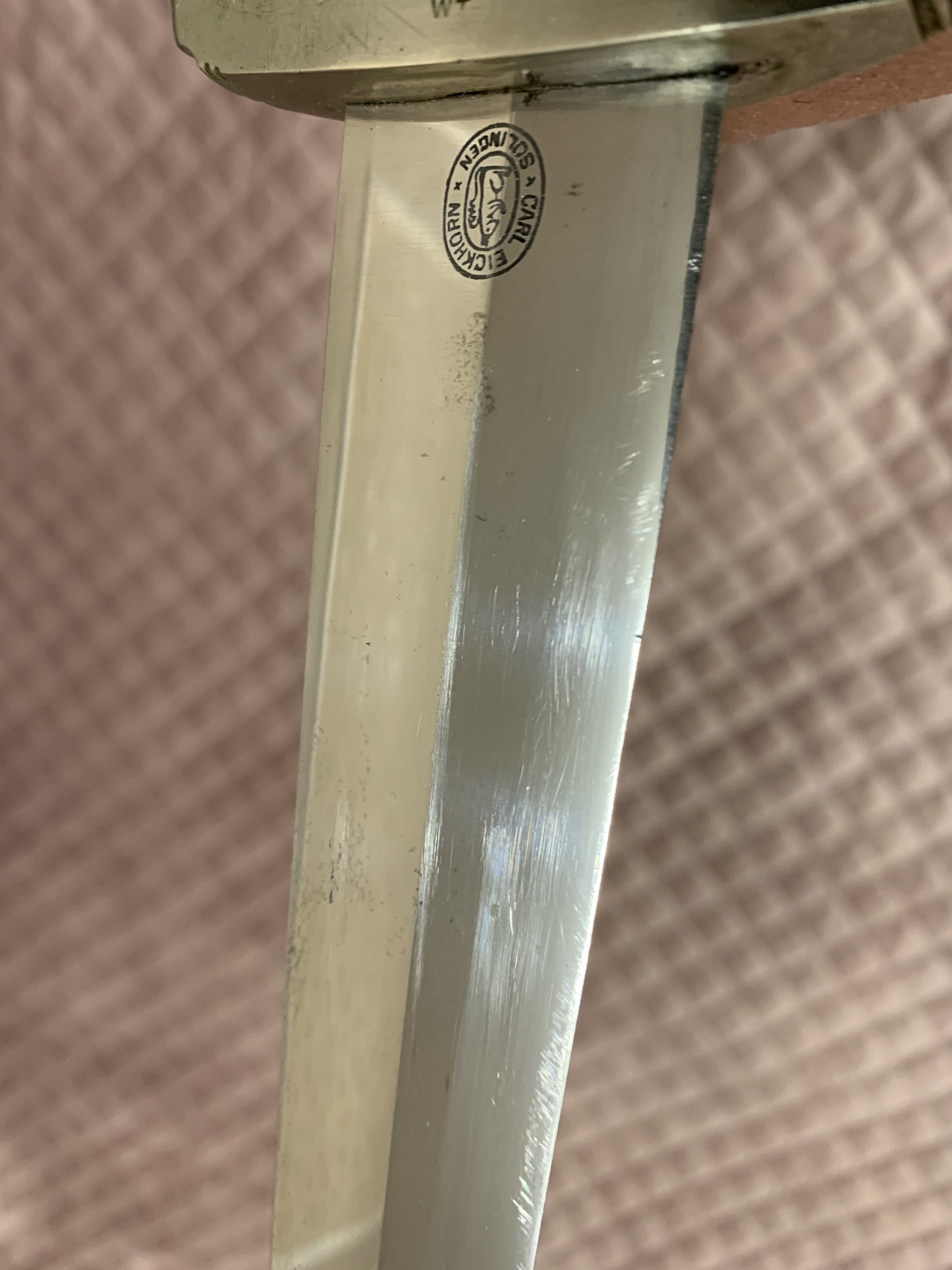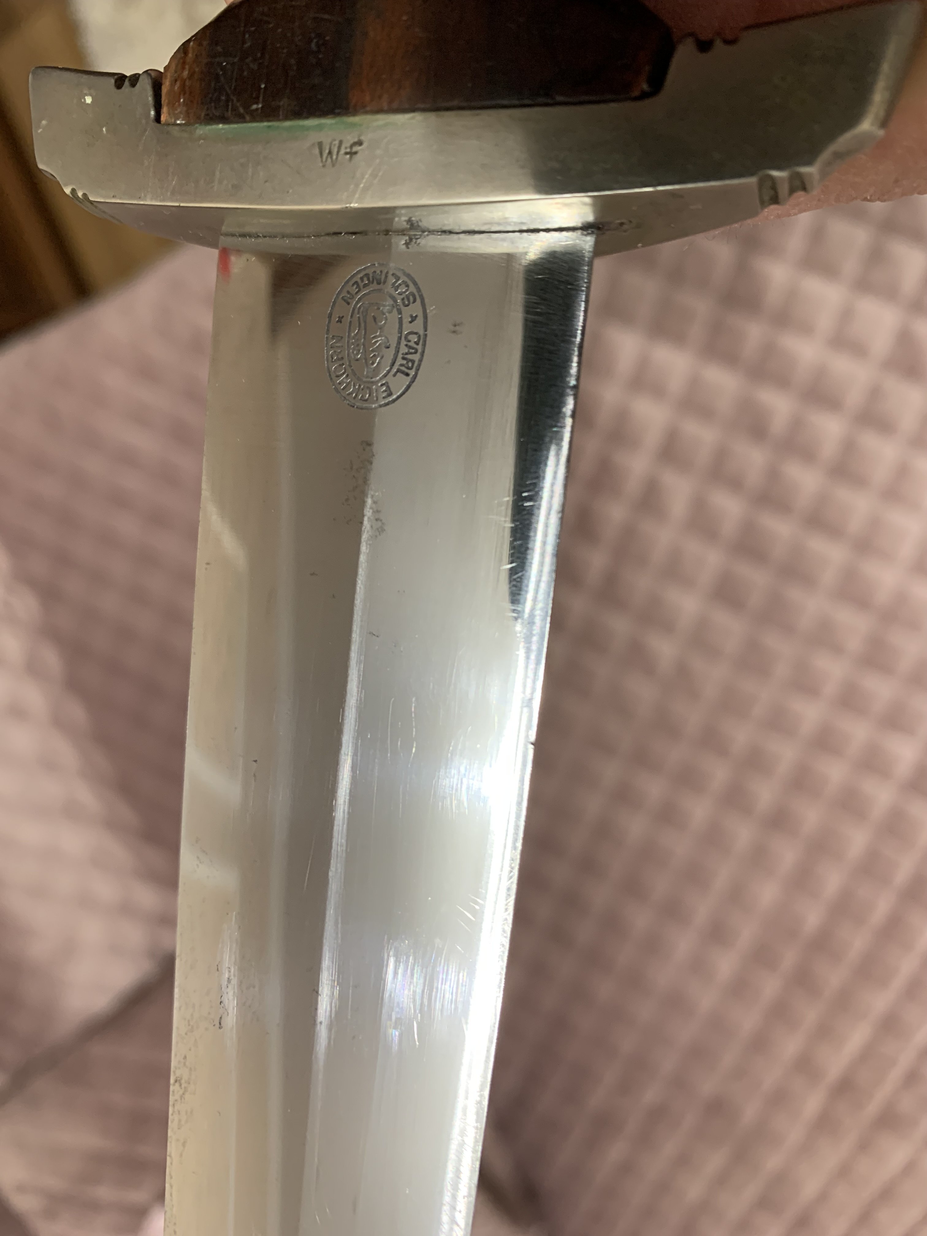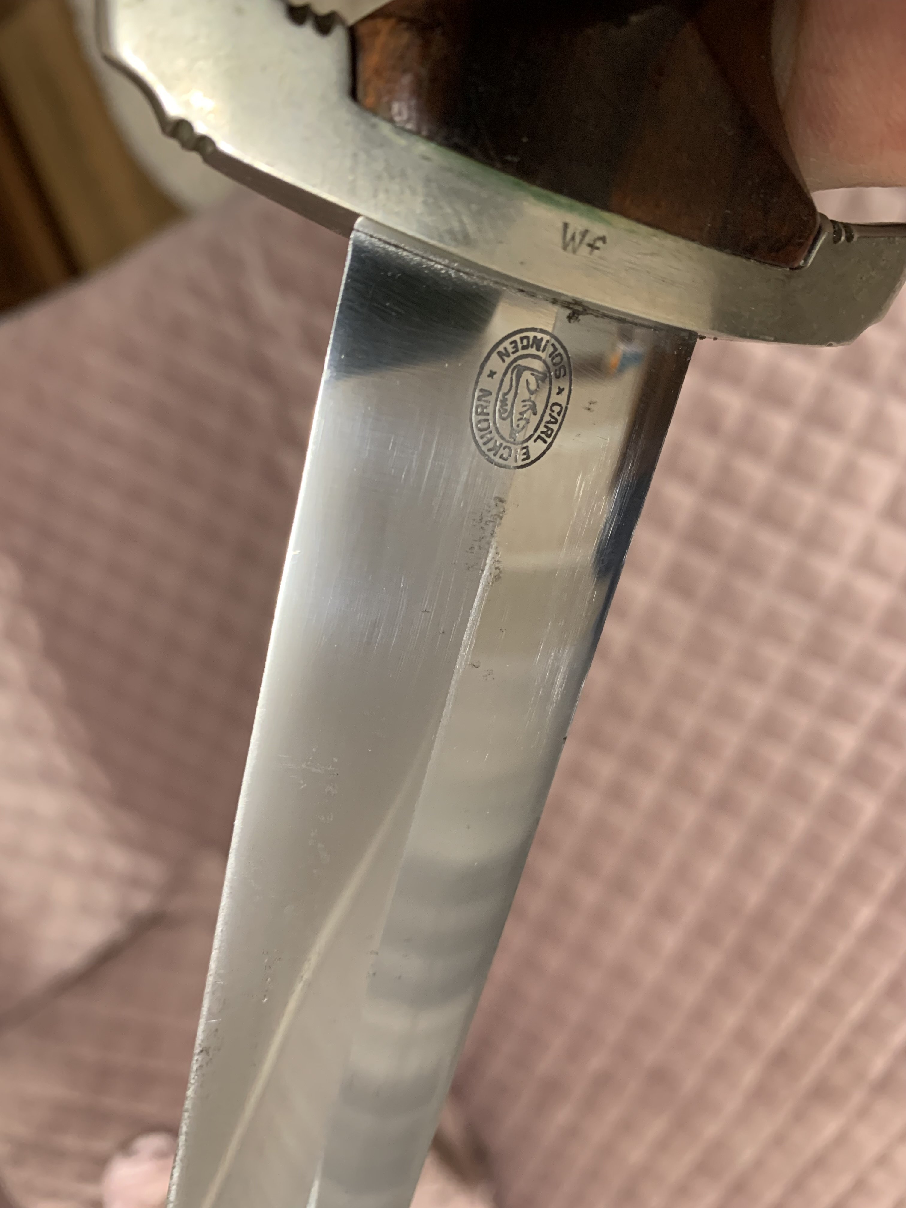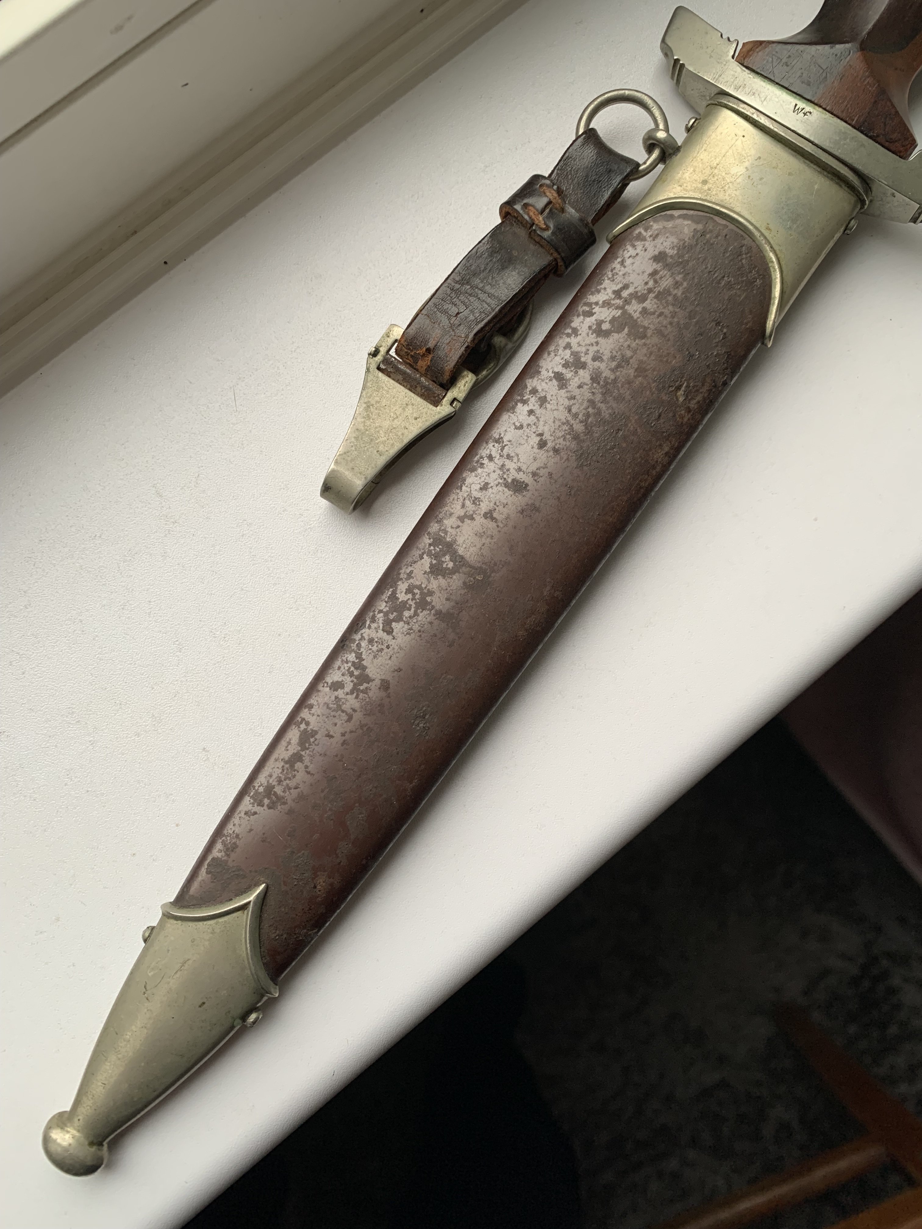 Вітаю. У вас оригінальний кинджал. З приємною патиною, що рідко можна зараз побачити. Знак района ГАУ Wf (Westfalen) відповідає цьому виробнику. Порада Вам: ніколи не потрібно розбирати кинджали. З товщиною леза у Вашого кинджала все нормально. Фото для прикладу, правда другого виробника.